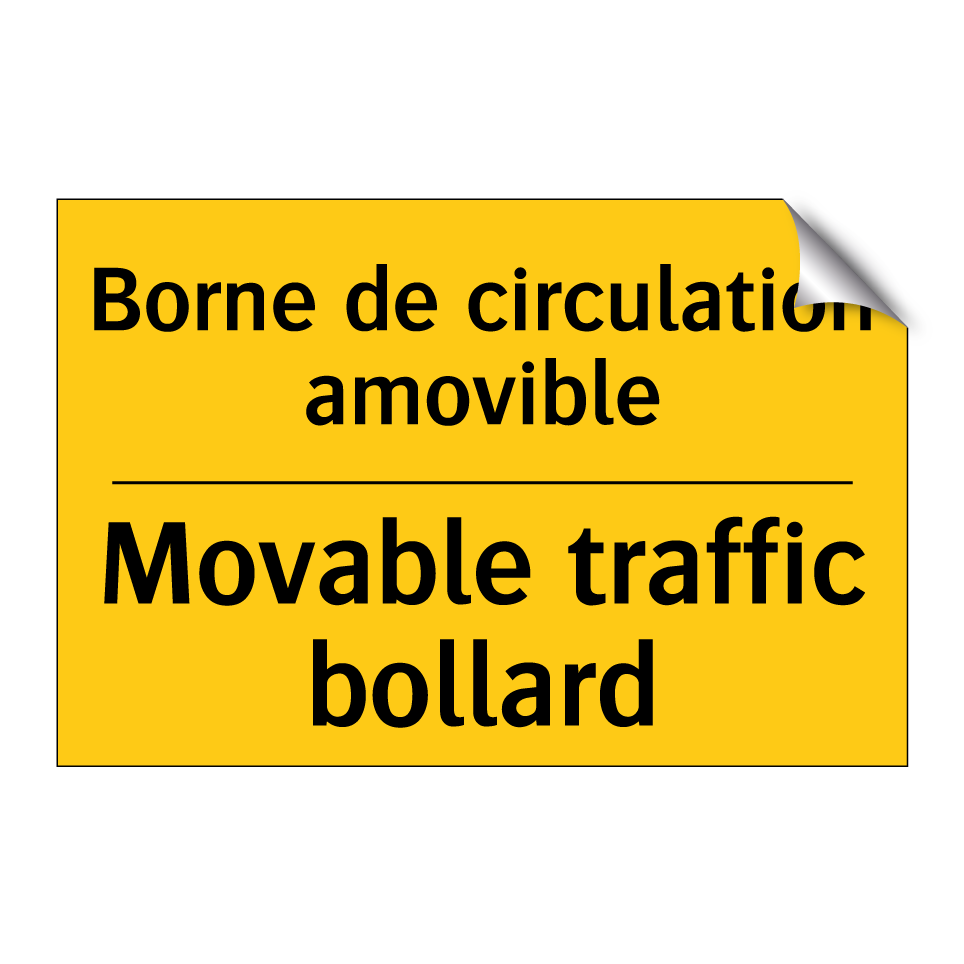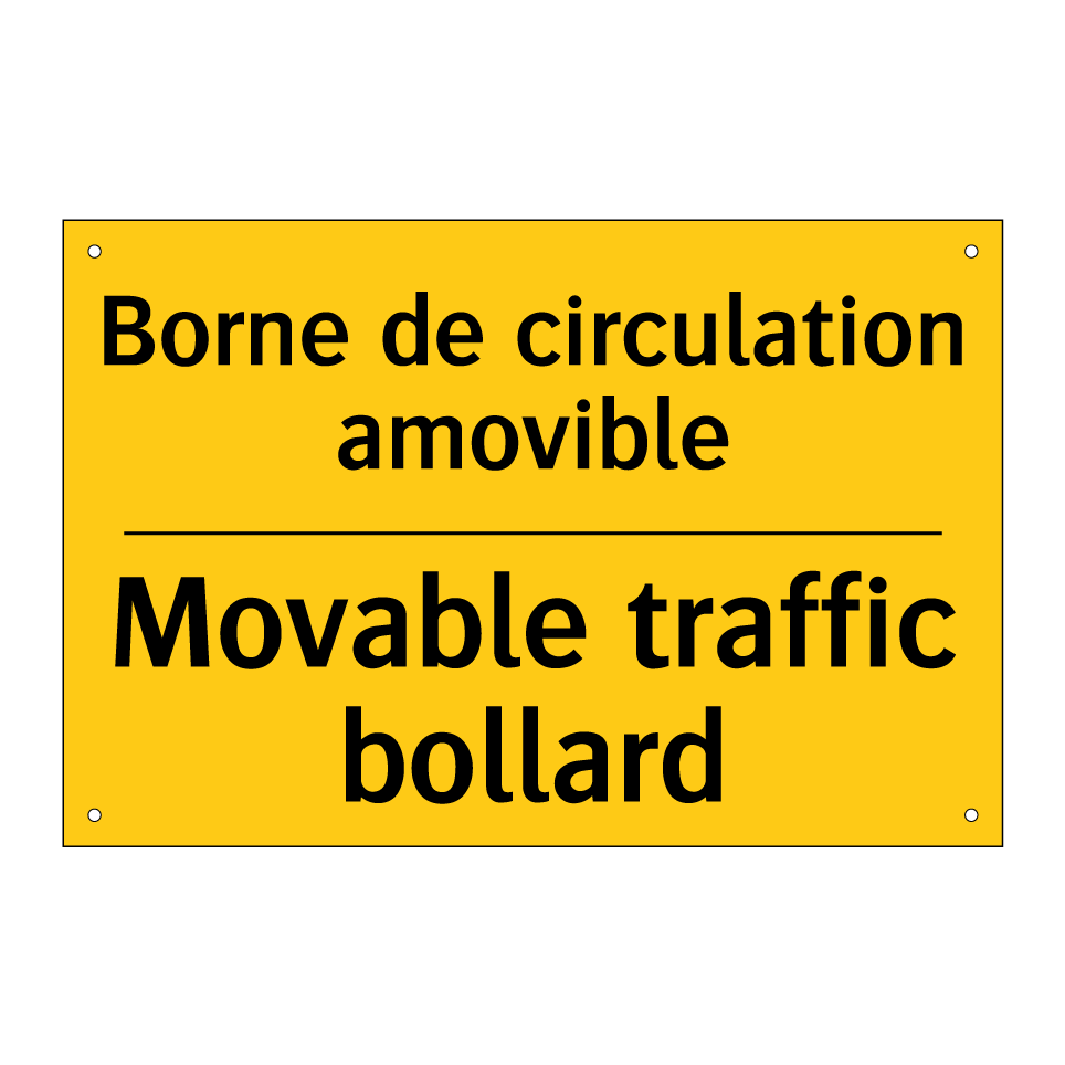 Panneau d'avertissement bilingue avec texte en français : "Borne de circulation amovible", et en anglais : "Movable traffic bollard"