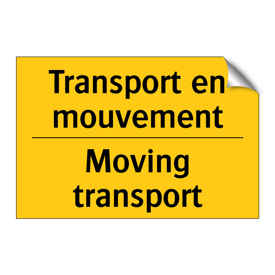 Panneau d'avertissement bilingue avec texte en français : "Transport en mouvement", et en anglais : "Moving transport"