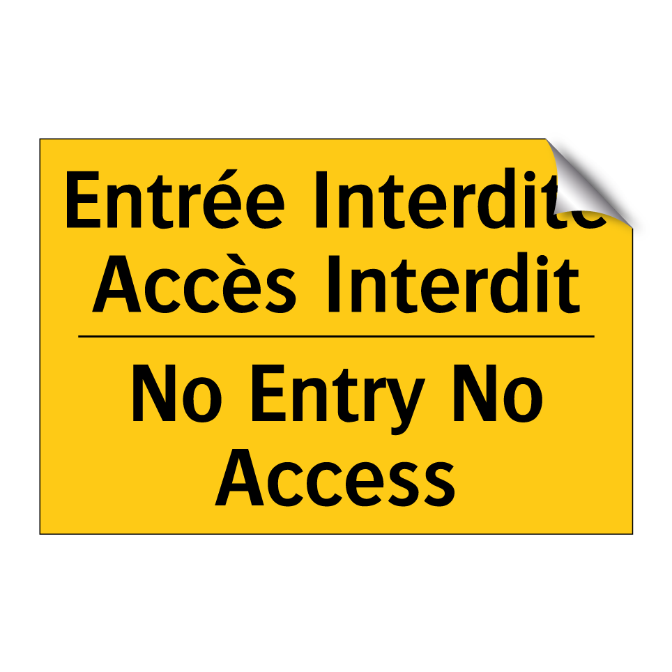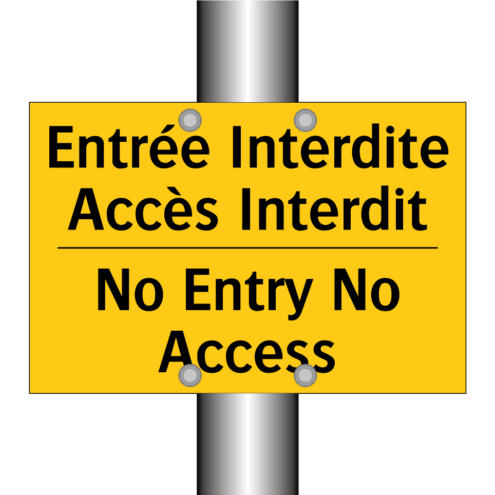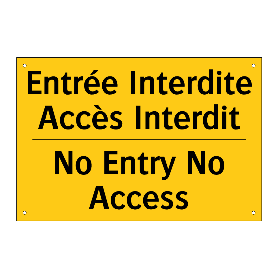 Panneau d'avertissement bilingue avec texte en français : "Entrée Interdite Accès Interdit", et en anglais : "No Entry No Access"