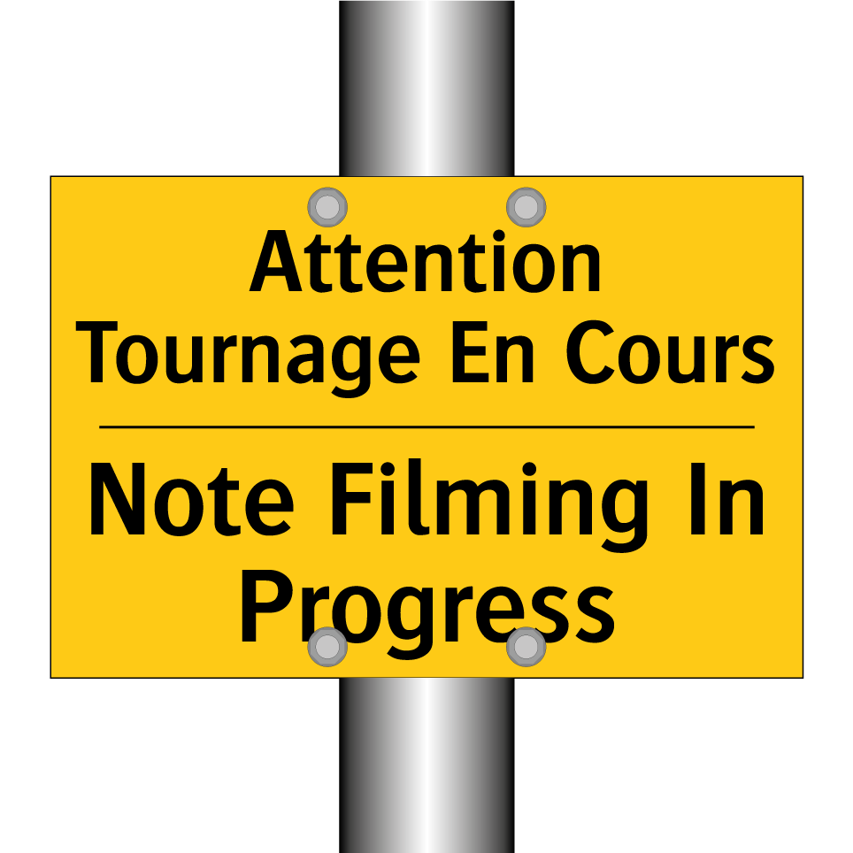 Panneau d'avertissement bilingue avec texte en français : "Attention Tournage En Cours", et en anglais : "Note Filming In Progress"