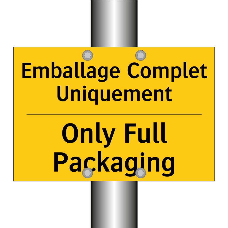Panneau d'avertissement bilingue avec texte en français : "Emballage Complet Uniquement", et en anglais : "Only Full Packaging"