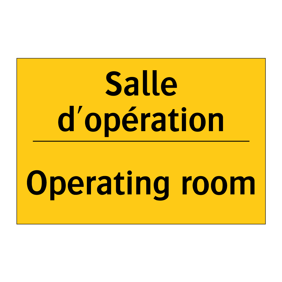 Panneau d'avertissement bilingue avec texte en français : "Salle d'opération", et en anglais : "Operating room"