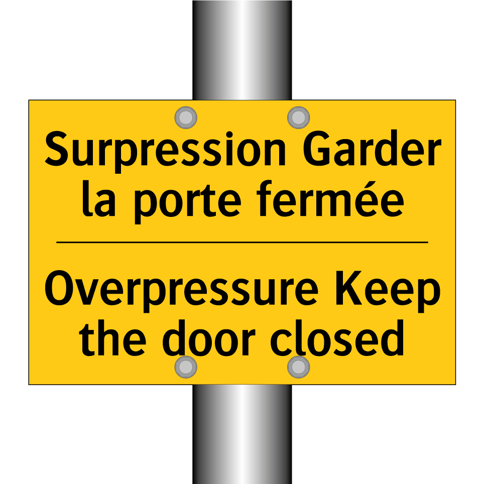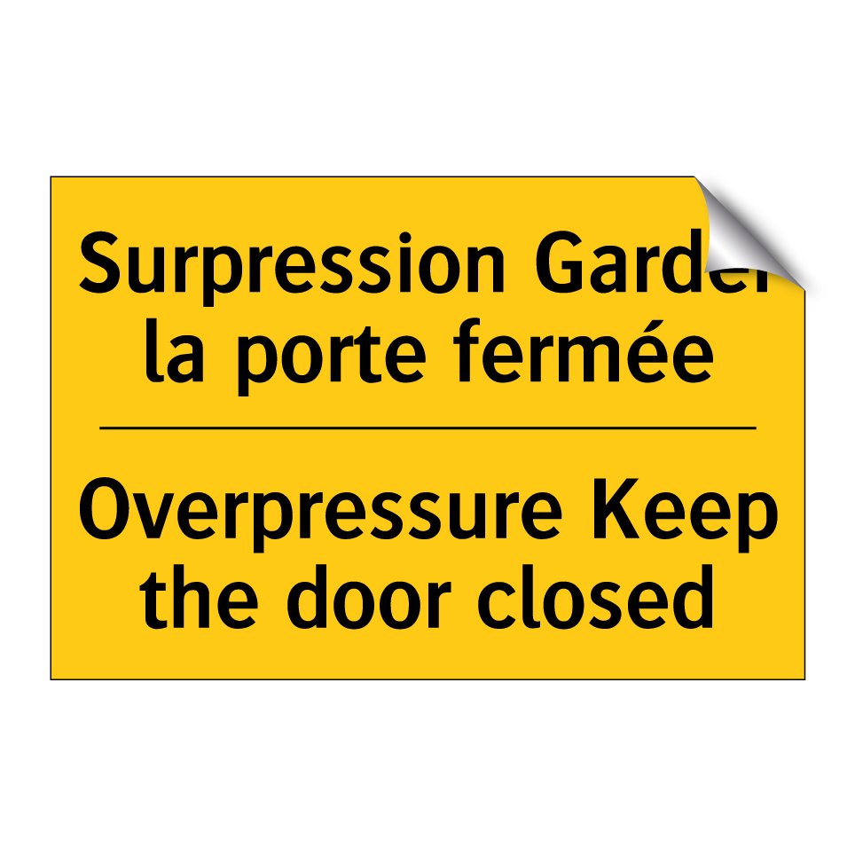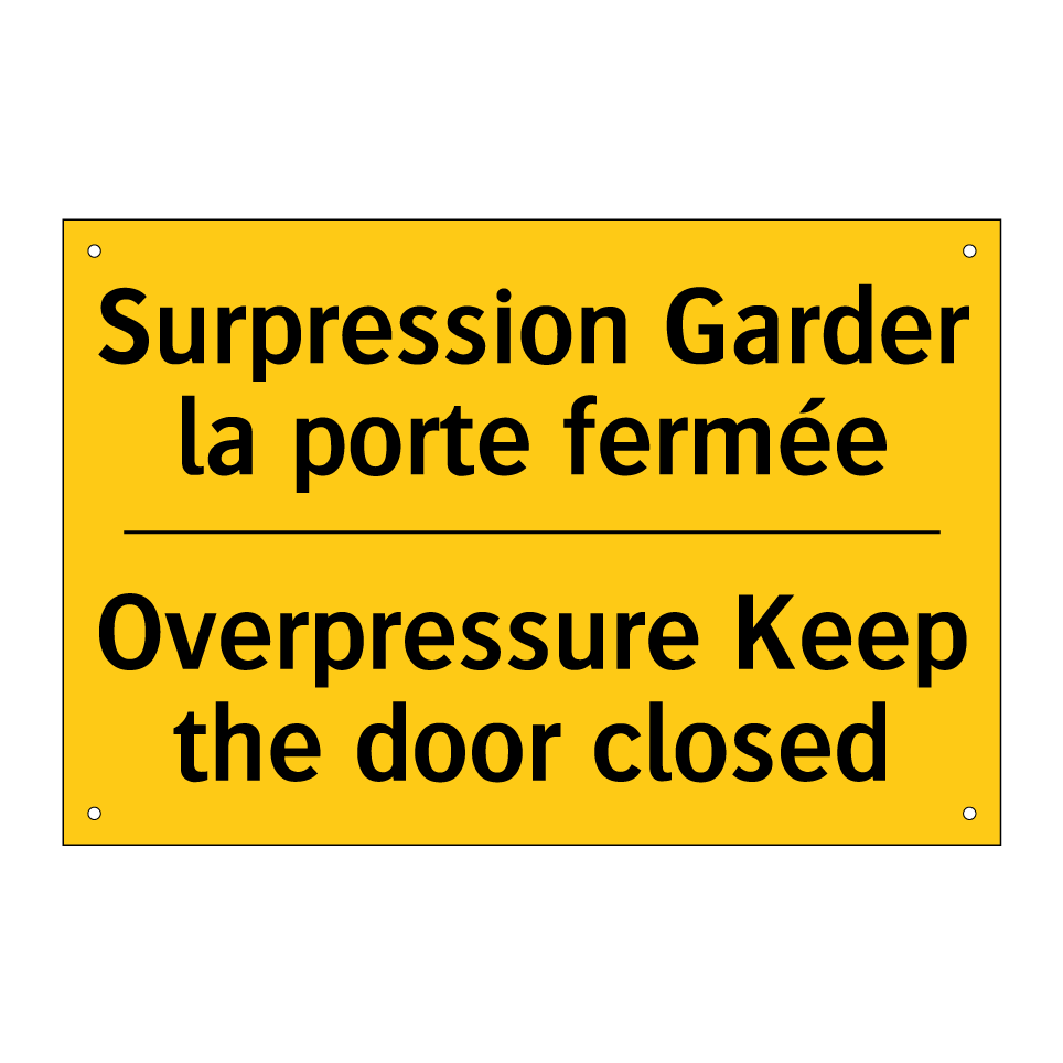 Panneau d'avertissement bilingue avec texte en français : "Surpression Garder la porte fermée", et en anglais : "Overpressure Keep the door closed"