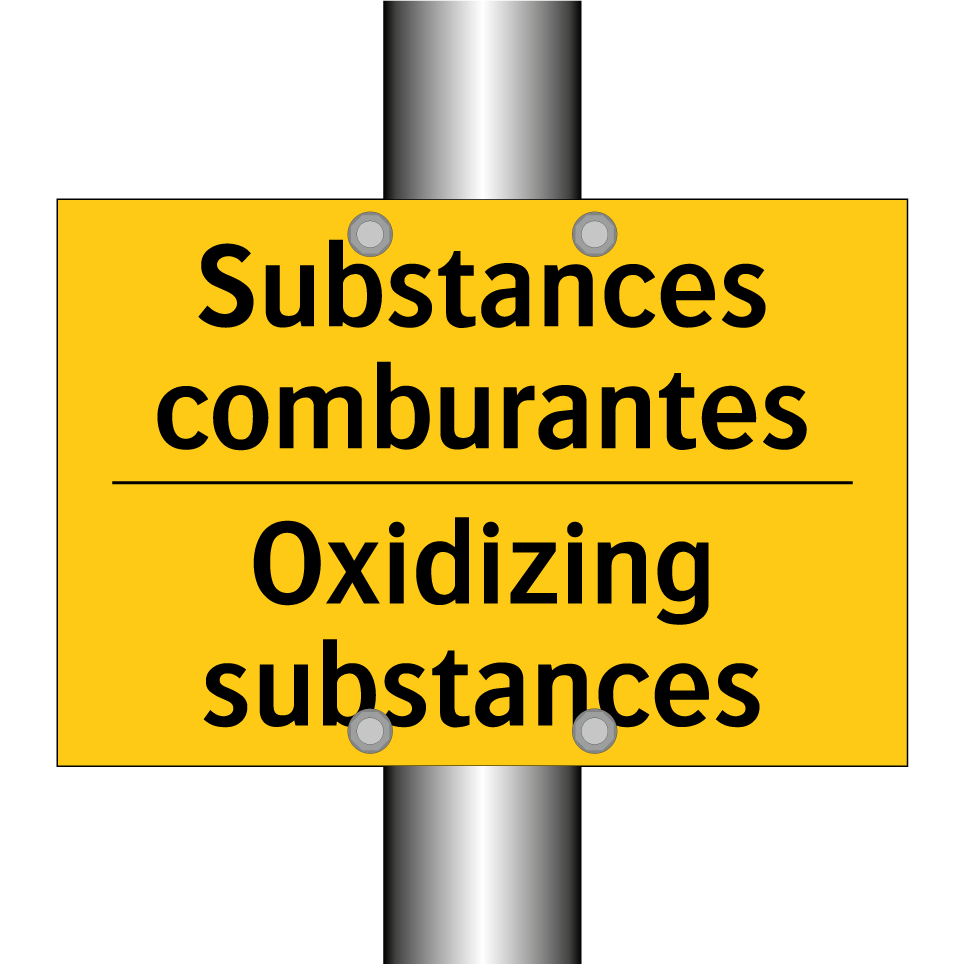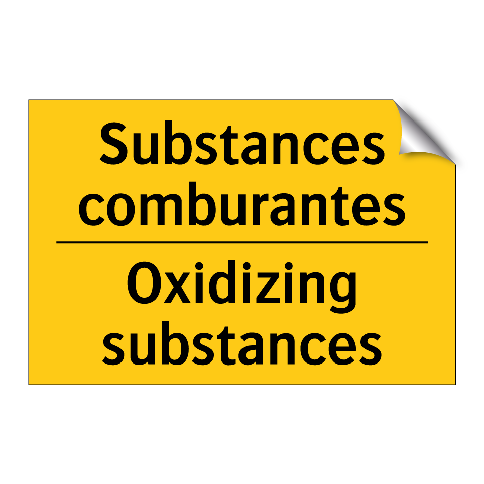 Panneau d'avertissement bilingue avec texte en français : "Substances comburantes", et en anglais : "Oxidizing substances"