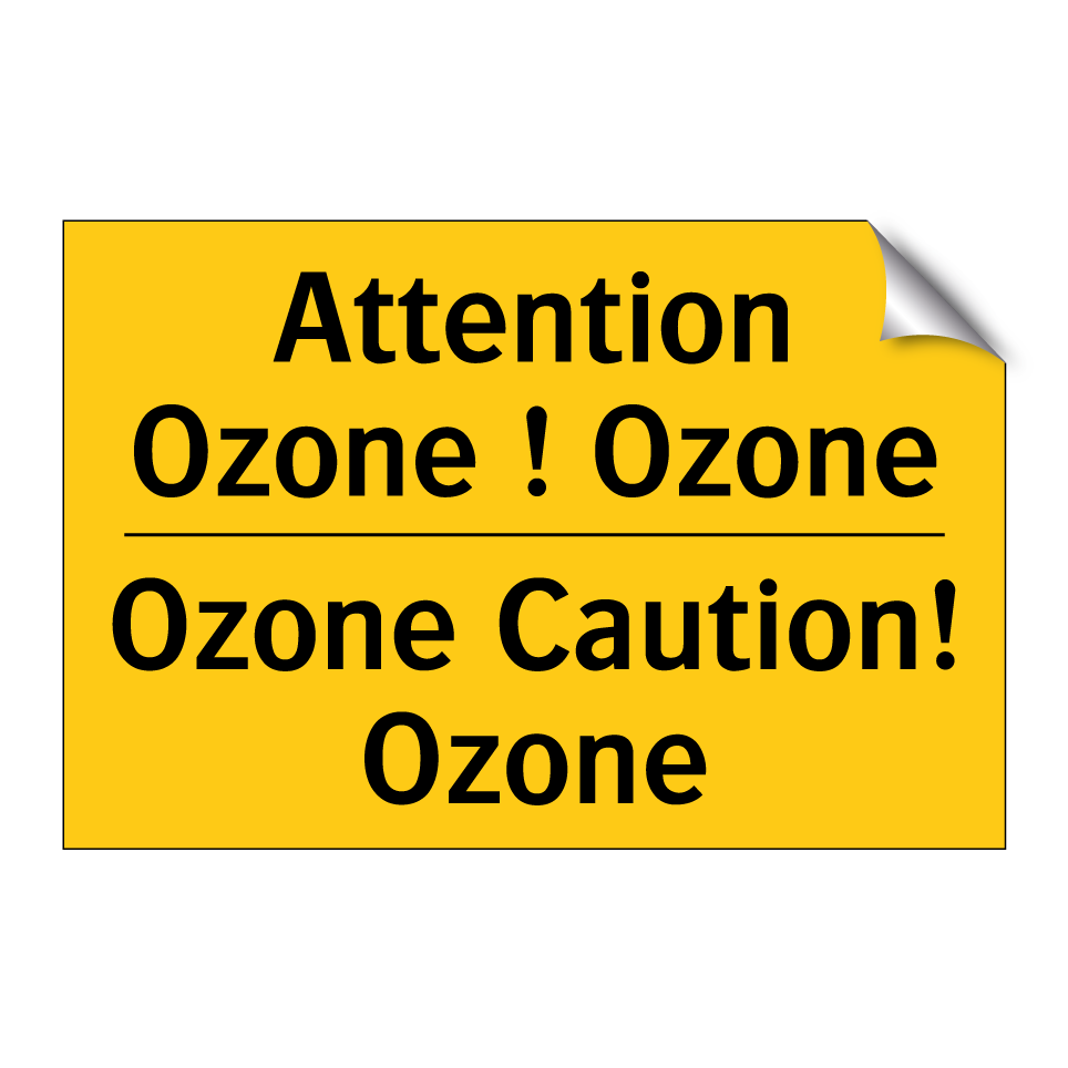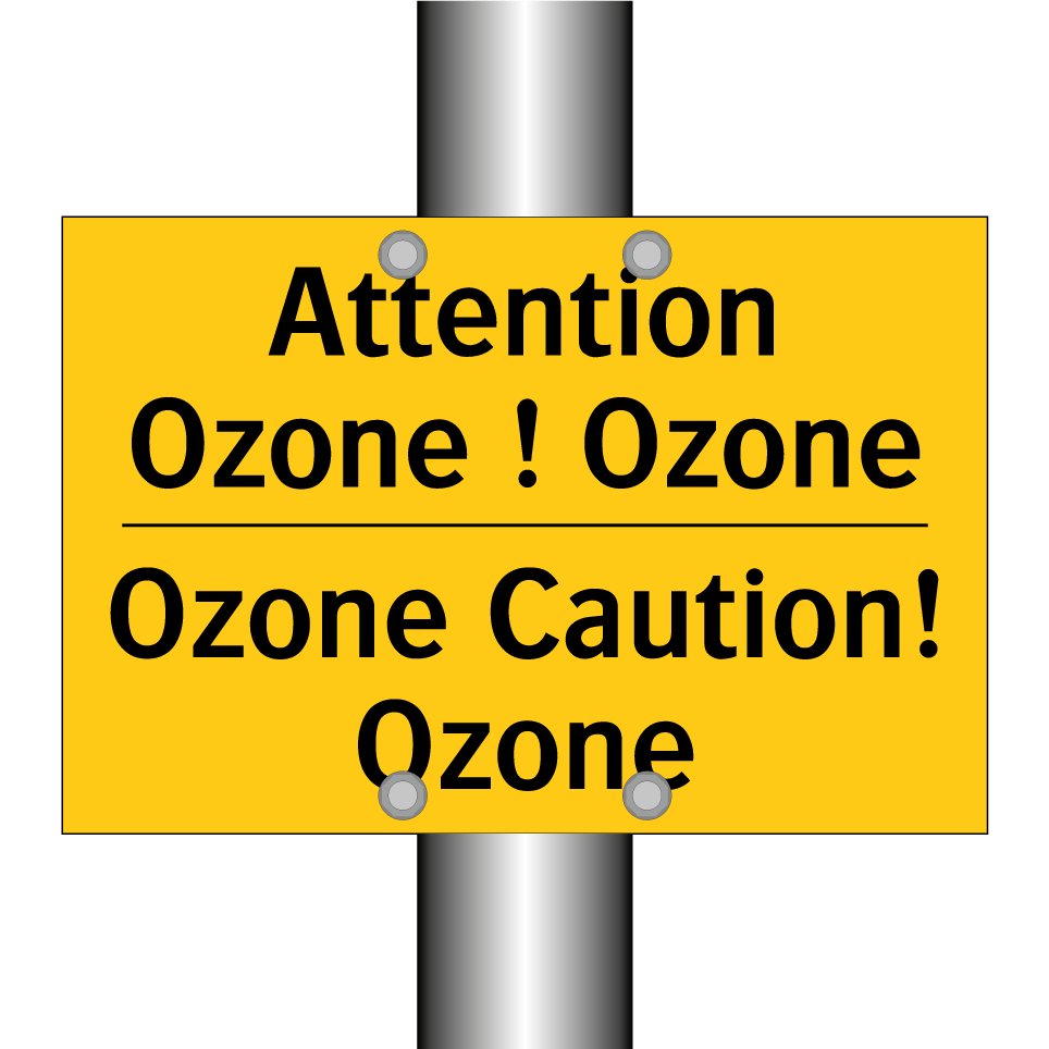 Panneau d'avertissement bilingue avec texte en français : "Attention Ozone ! Ozone", et en anglais : "Ozone Caution! Ozone"