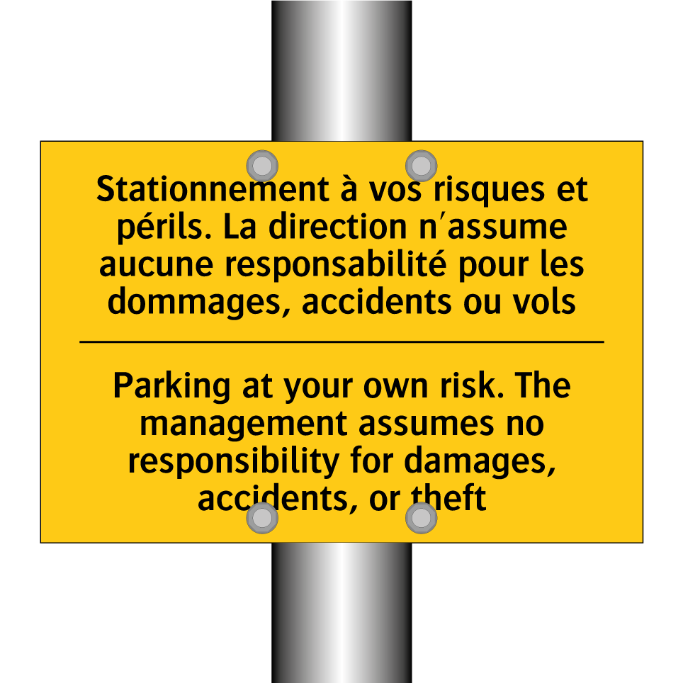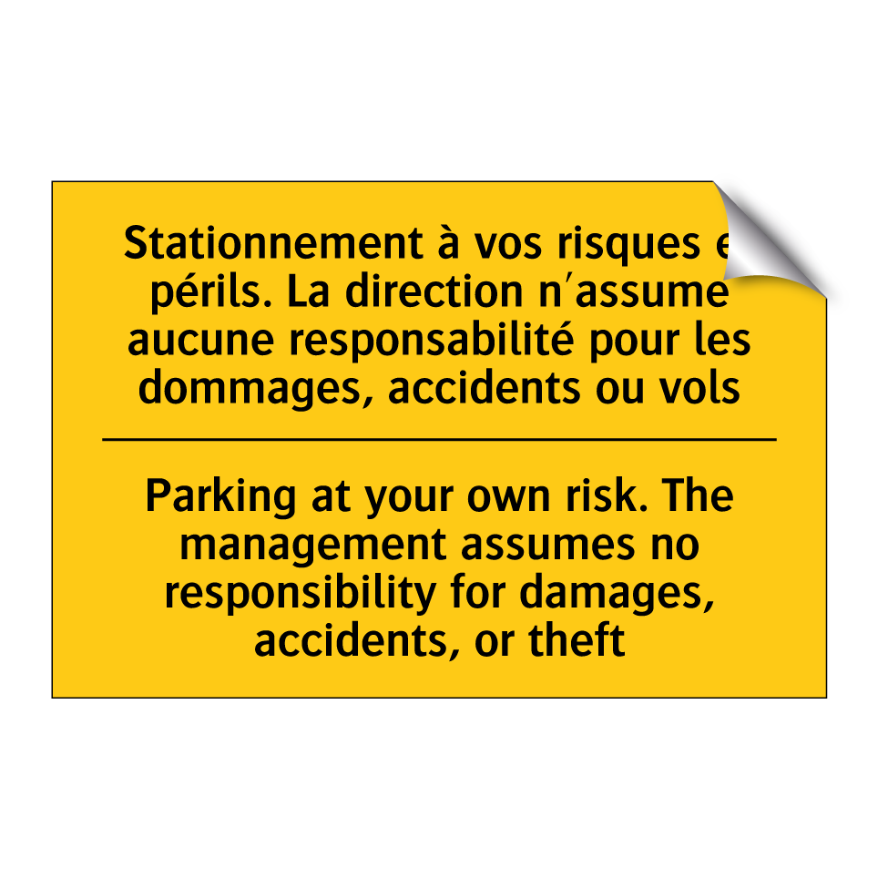 Panneau d'avertissement bilingue avec texte en français : "Stationnement à vos risques et périls. La direction n'assume aucune responsabilité pour les dommages, accidents ou vols", et en anglais : "Parking at your own risk. The management assumes no responsibility for damages, accidents, or theft"