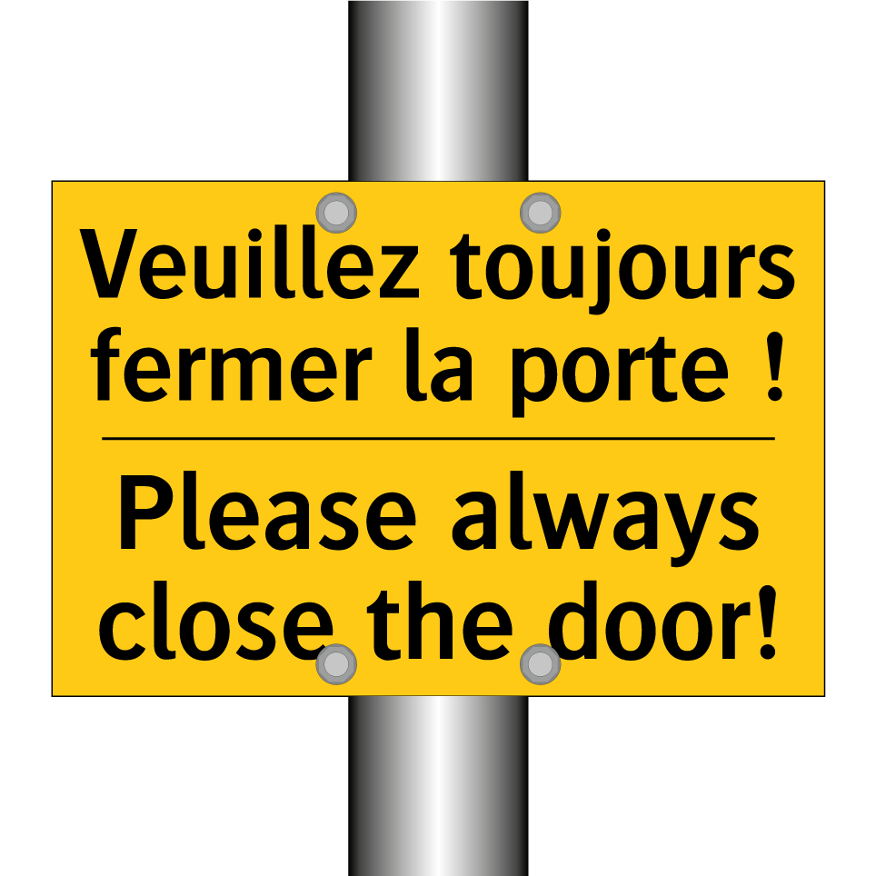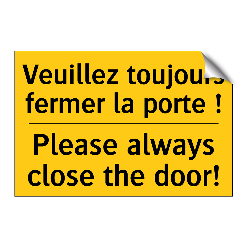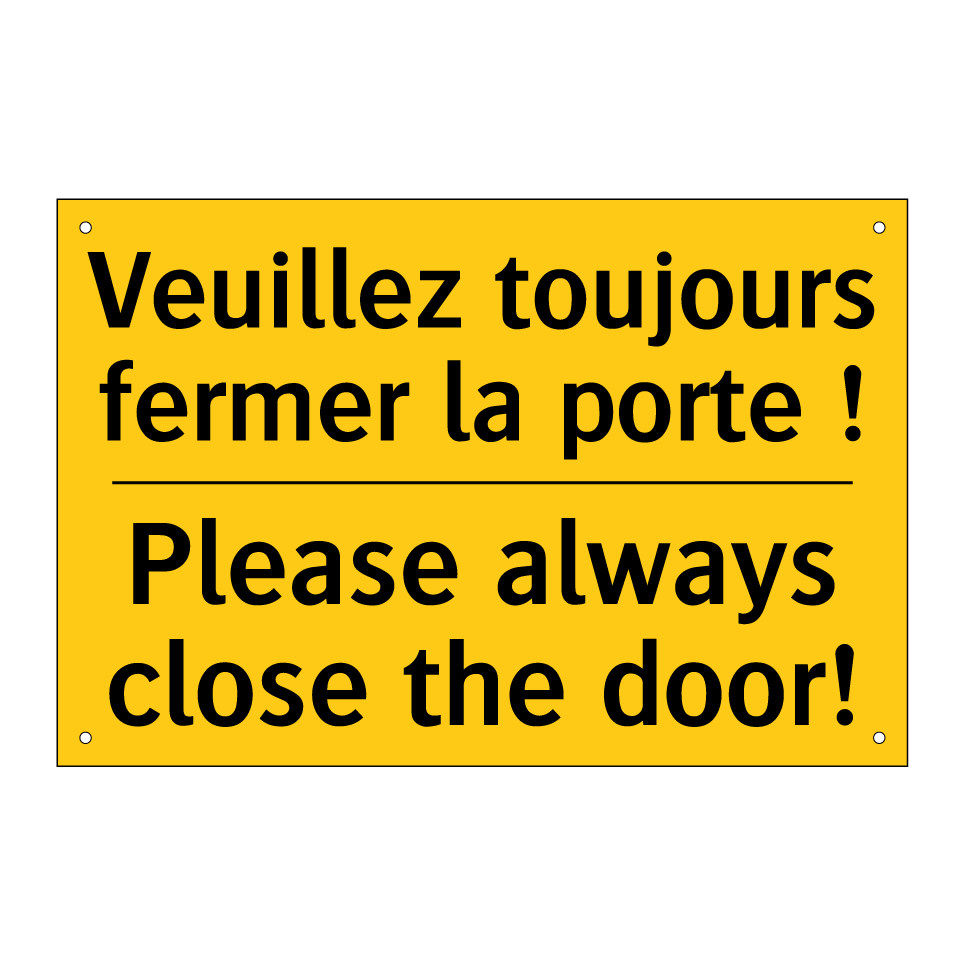 Panneau d'avertissement bilingue avec texte en français : "Veuillez toujours fermer la porte !", et en anglais : "Please always close the door!"