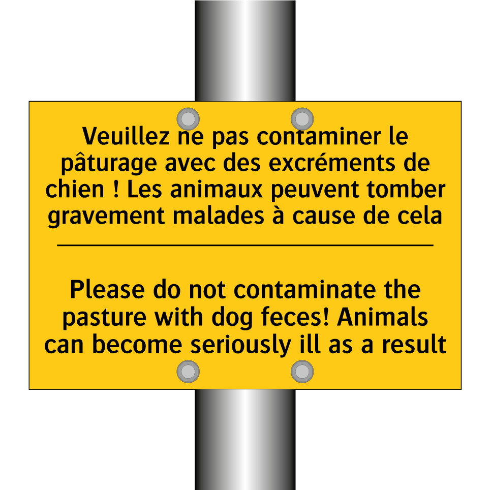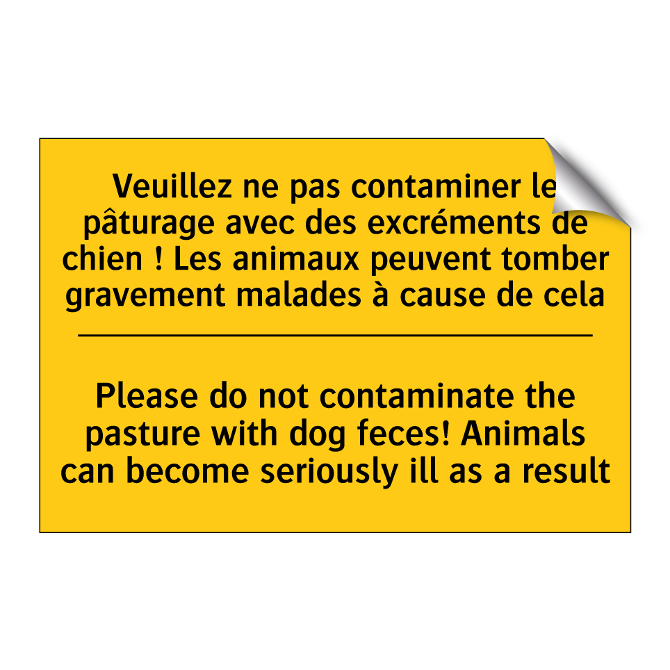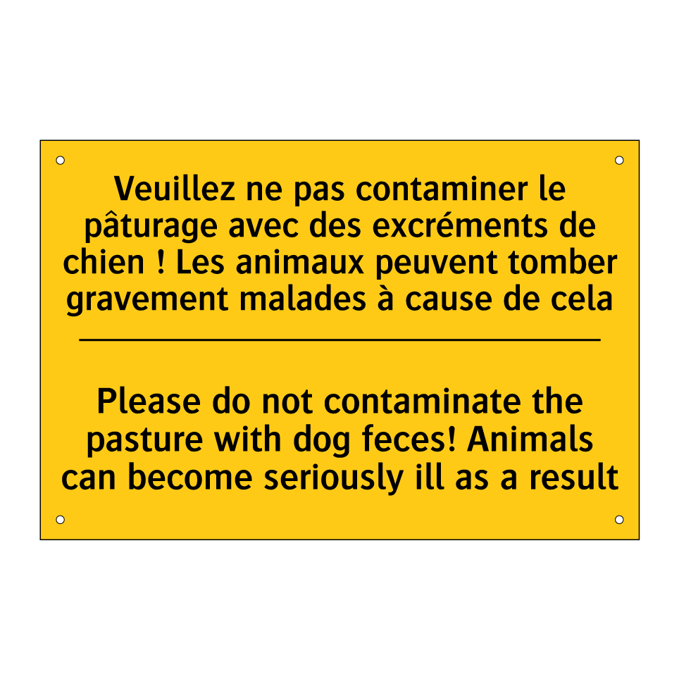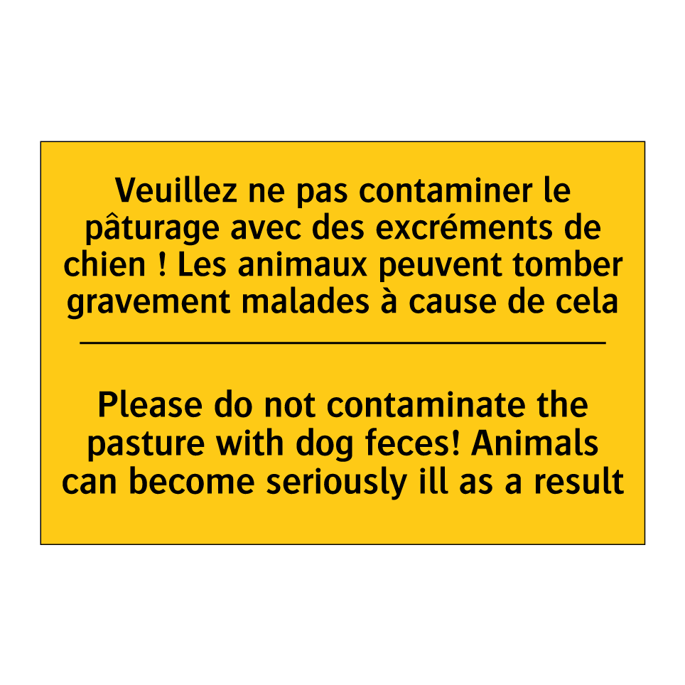 Panneau d'avertissement bilingue avec texte en français : "Veuillez ne pas contaminer le pâturage avec des excréments de chien ! Les animaux peuvent tomber gravement malades à cause de cela", et en anglais : "Please do not contaminate the pasture with dog feces! Animals can become seriously ill as a result"