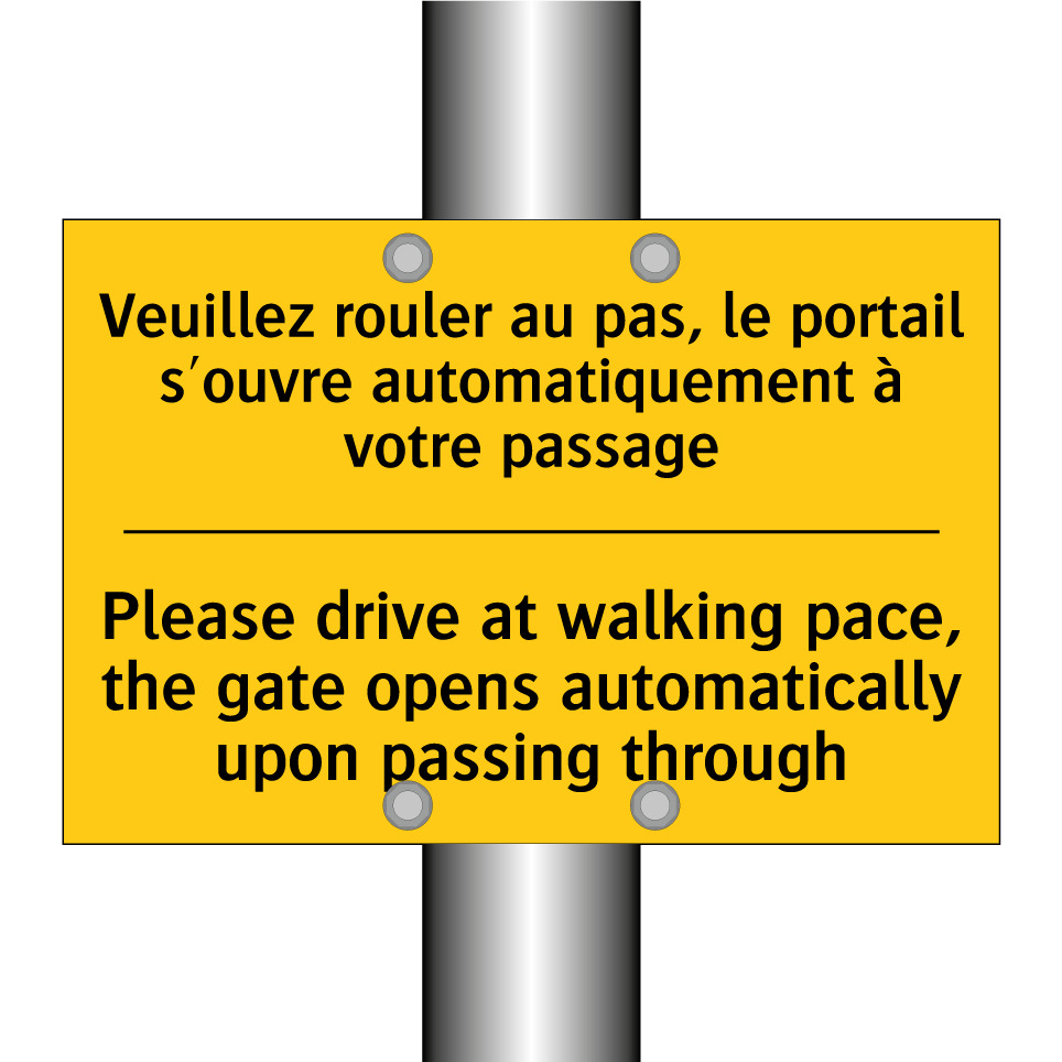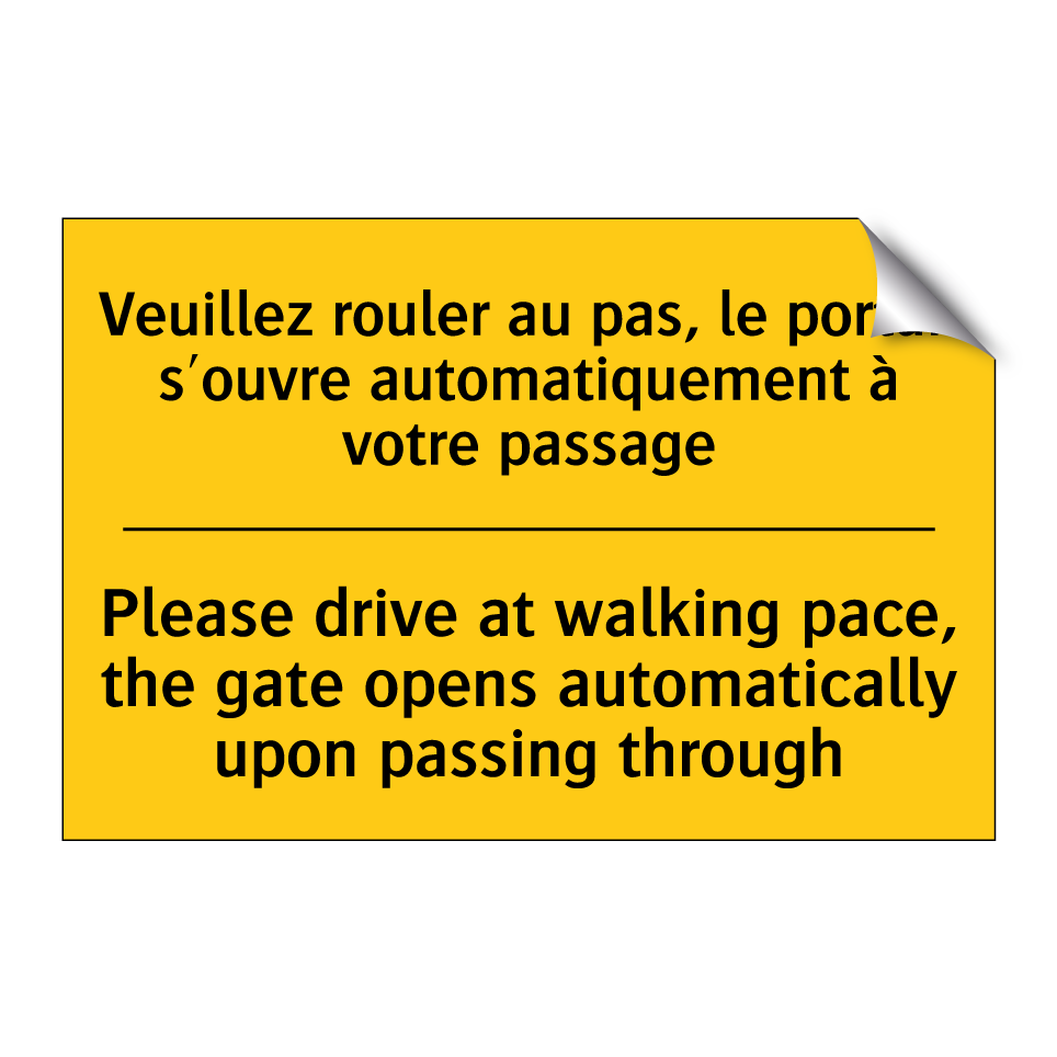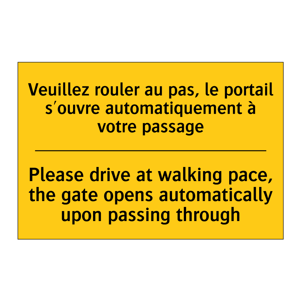 Panneau d'avertissement bilingue avec texte en français : "Veuillez rouler au pas, le portail s'ouvre automatiquement à votre passage", et en anglais : "Please drive at walking pace, the gate opens automatically upon passing through"