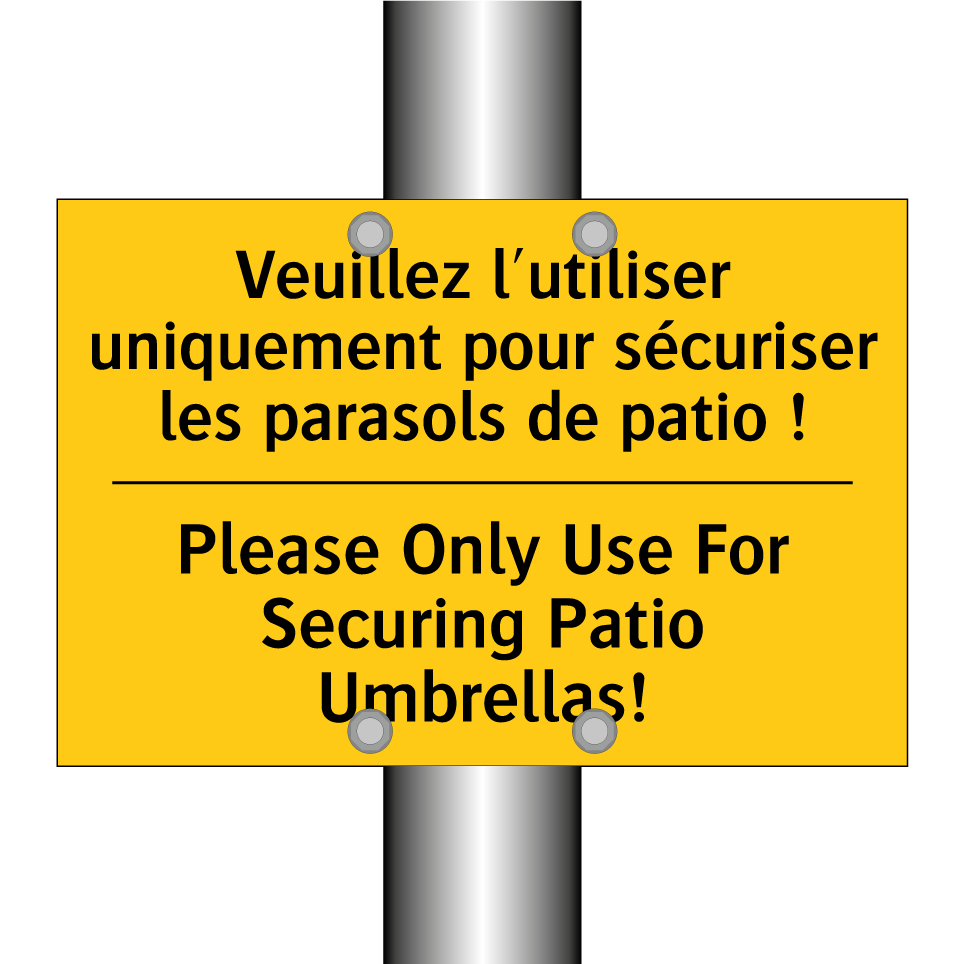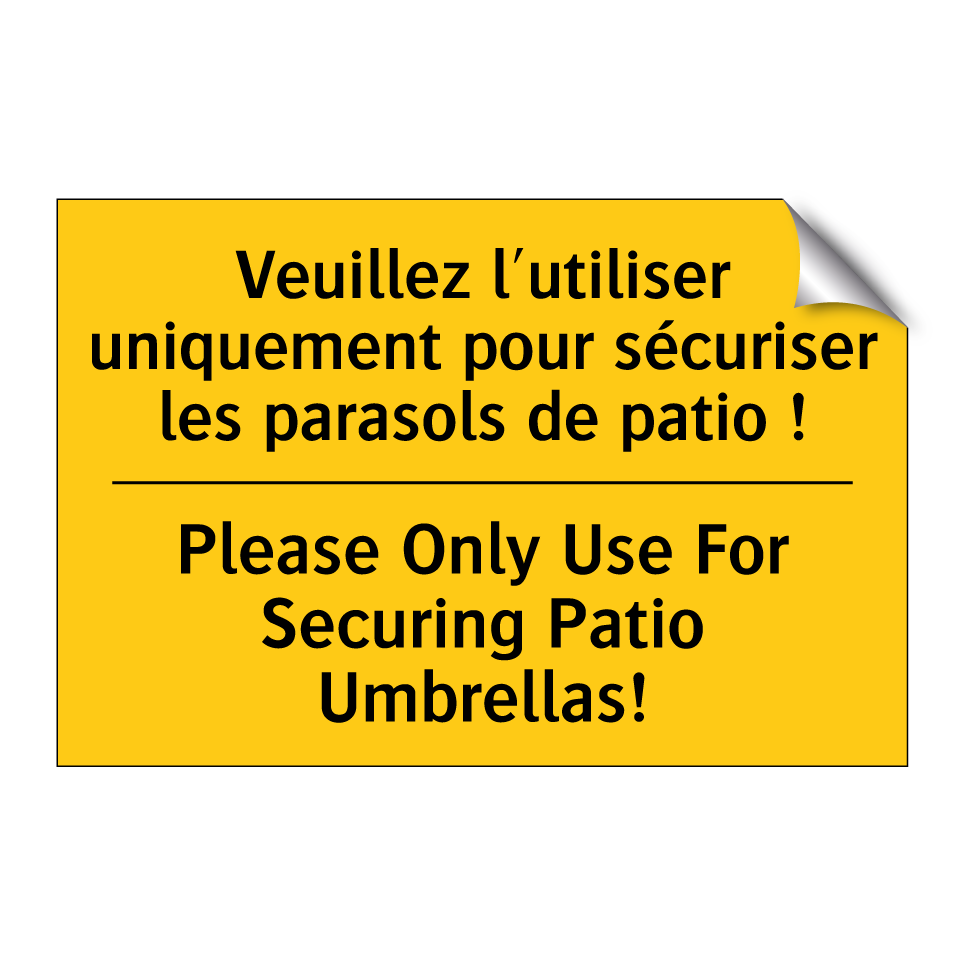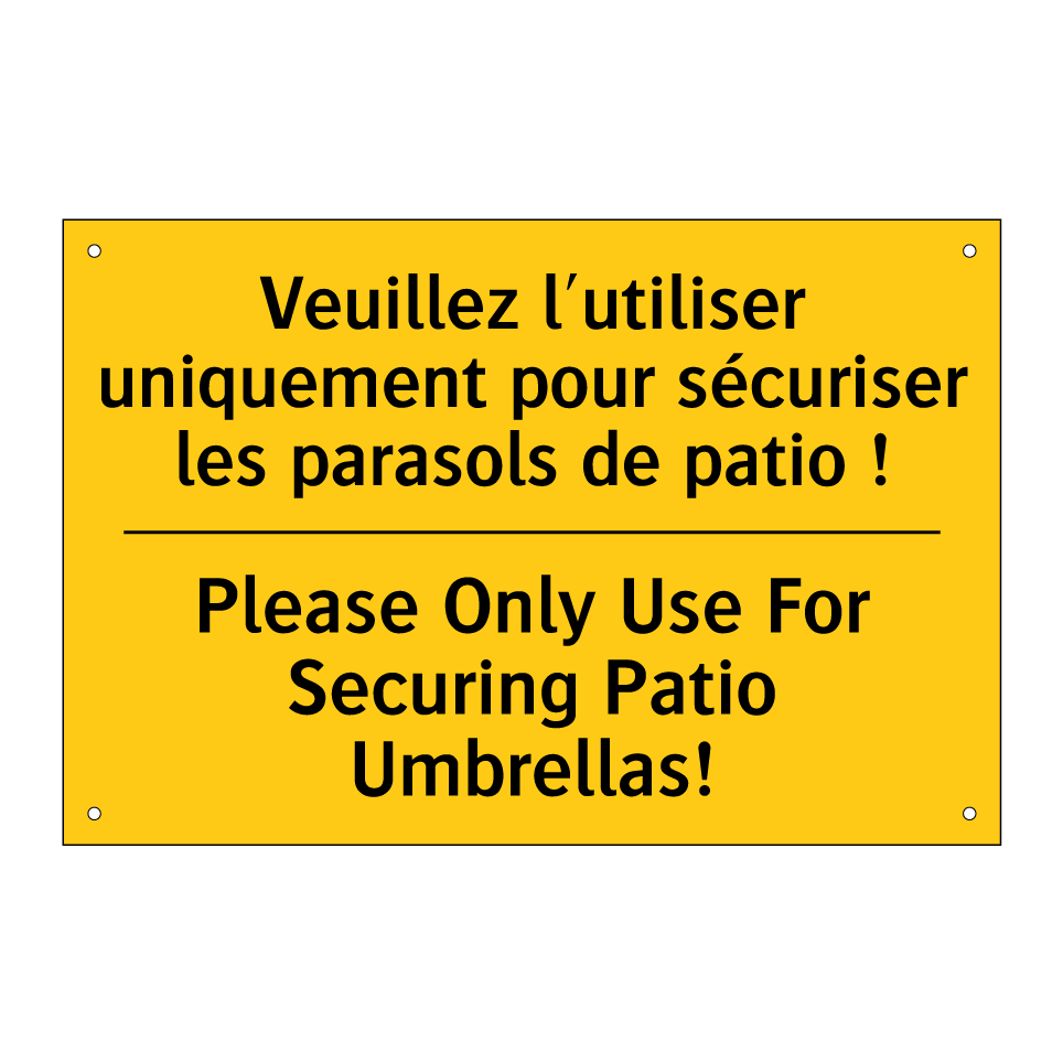 Panneau d'avertissement bilingue avec texte en français : "Veuillez l'utiliser uniquement pour sécuriser les parasols de patio !", et en anglais : "Please Only Use For Securing Patio Umbrellas!"