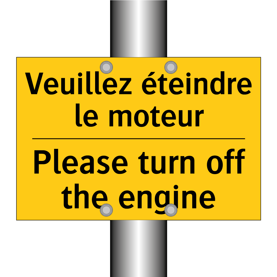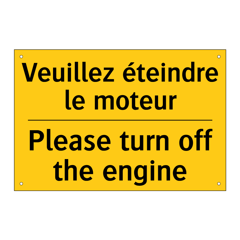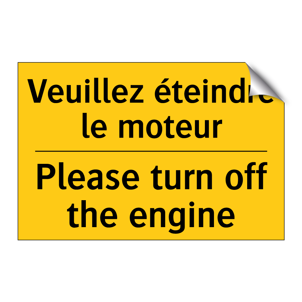 Panneau d'avertissement bilingue avec texte en français : "Veuillez éteindre le moteur", et en anglais : "Please turn off the engine"