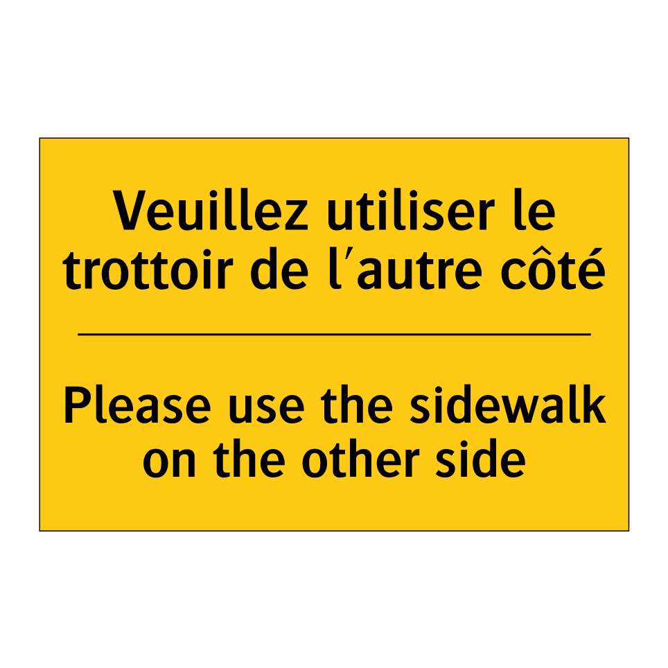 Panneau d'avertissement bilingue avec texte en français : "Veuillez utiliser le trottoir de l'autre côté", et en anglais : "Please use the sidewalk on the other side"