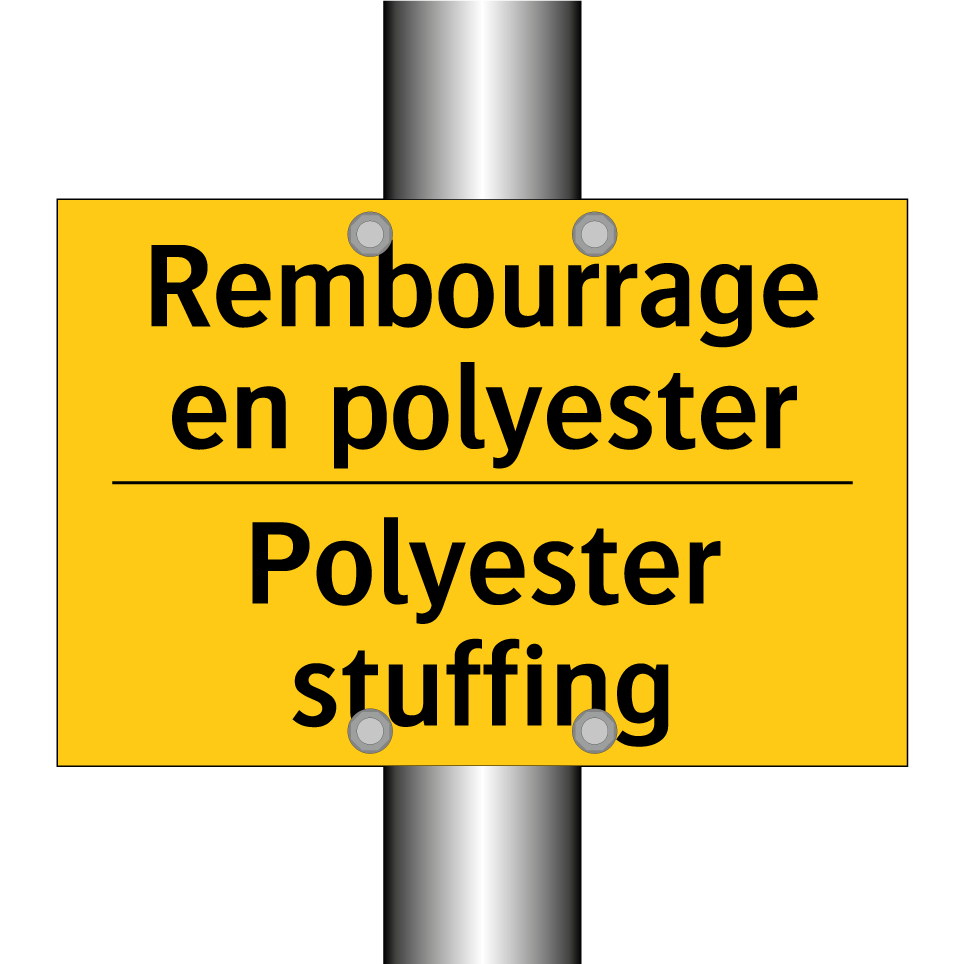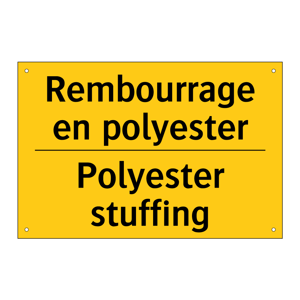 Panneau d'avertissement bilingue avec texte en français : "Rembourrage en polyester", et en anglais : "Polyester stuffing"