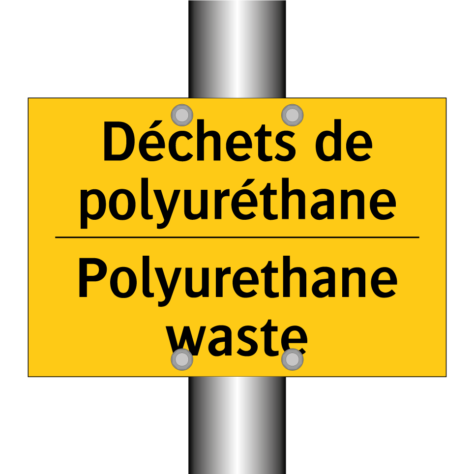 Panneau d'avertissement bilingue avec texte en français : "Déchets de polyuréthane", et en anglais : "Polyurethane waste"