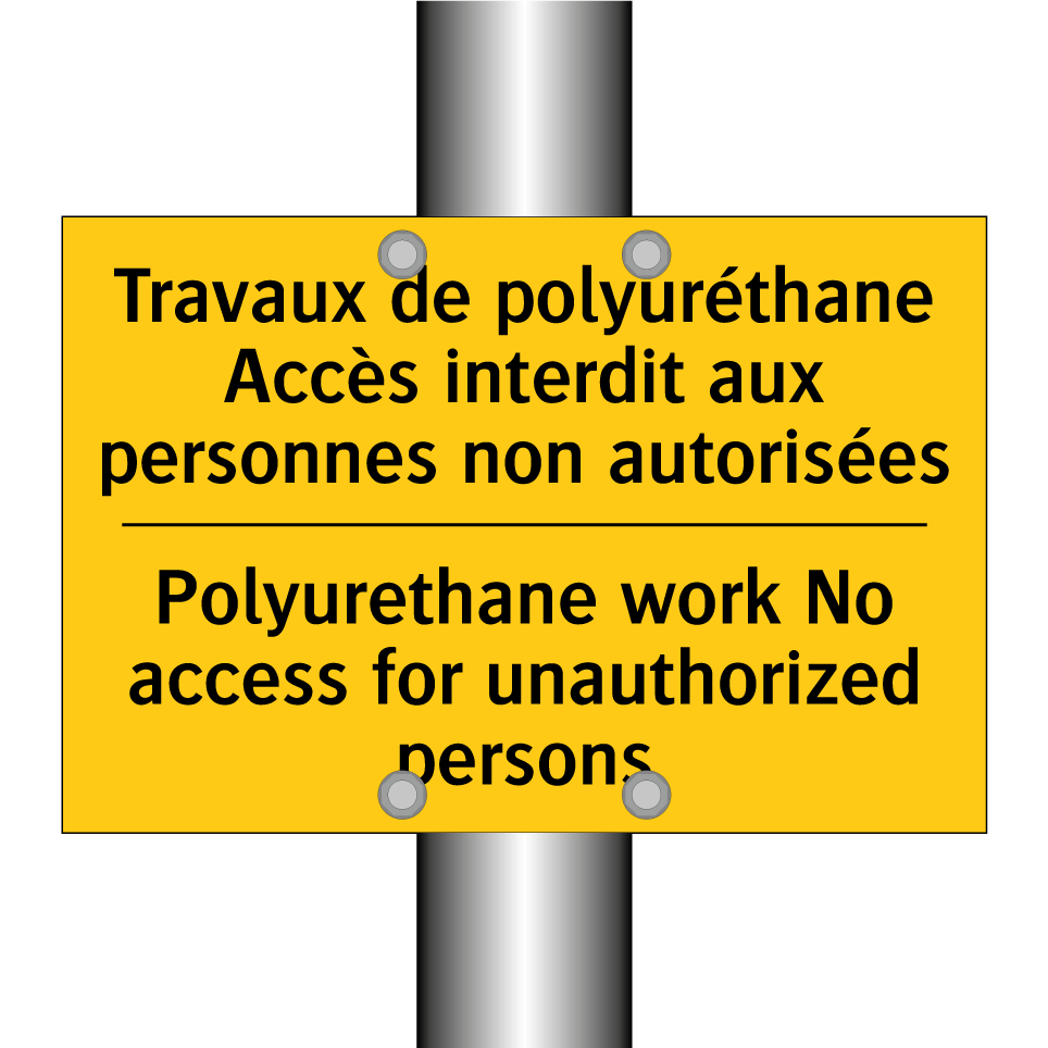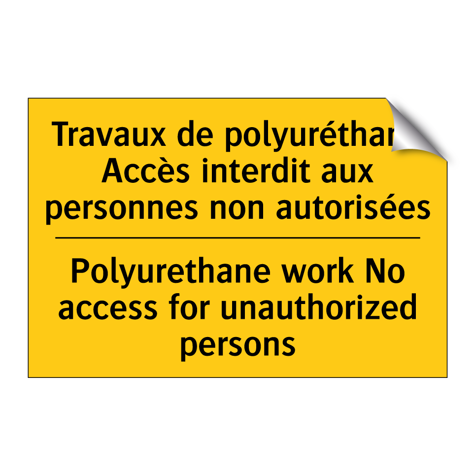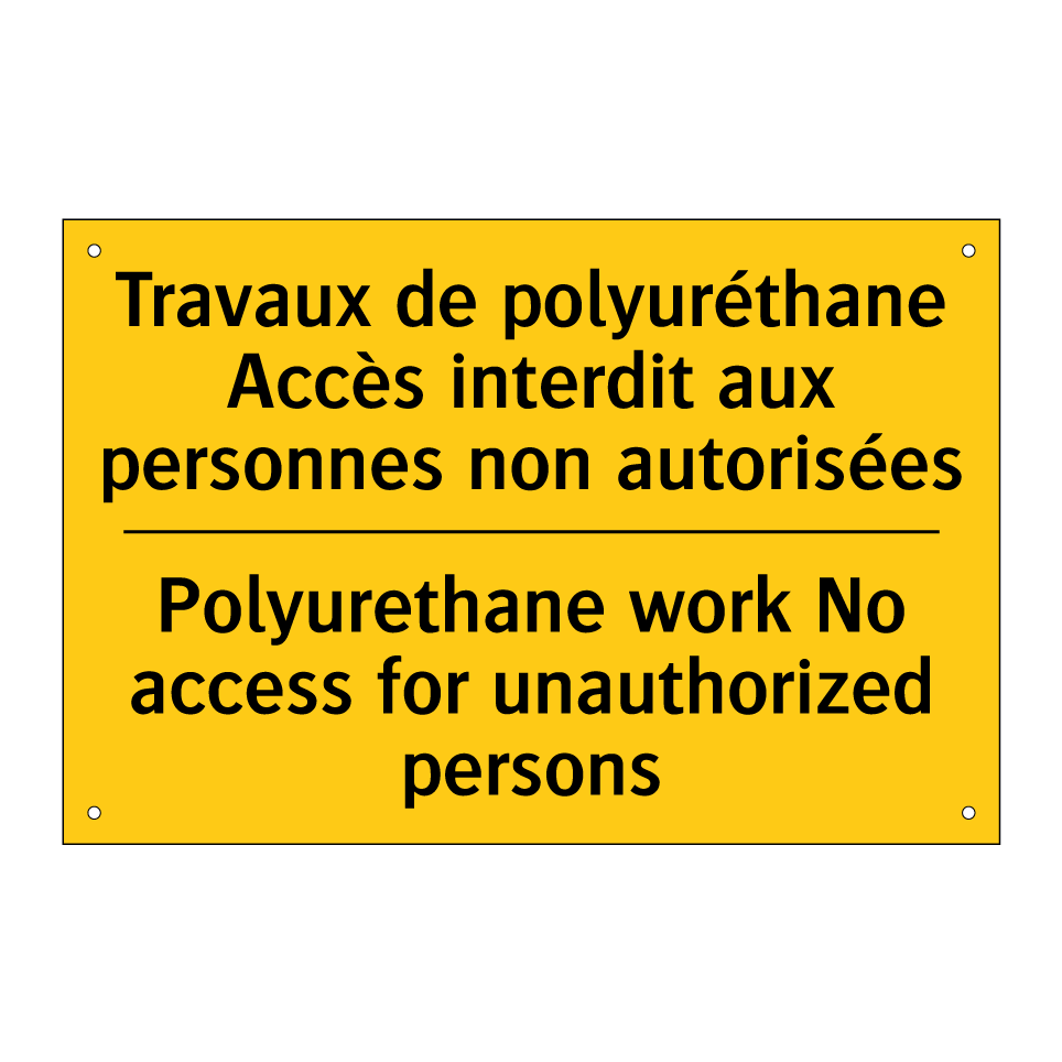 Panneau d'avertissement bilingue avec texte en français : "Travaux de polyuréthane Accès interdit aux personnes non autorisées", et en anglais : "Polyurethane work No access for unauthorized persons"