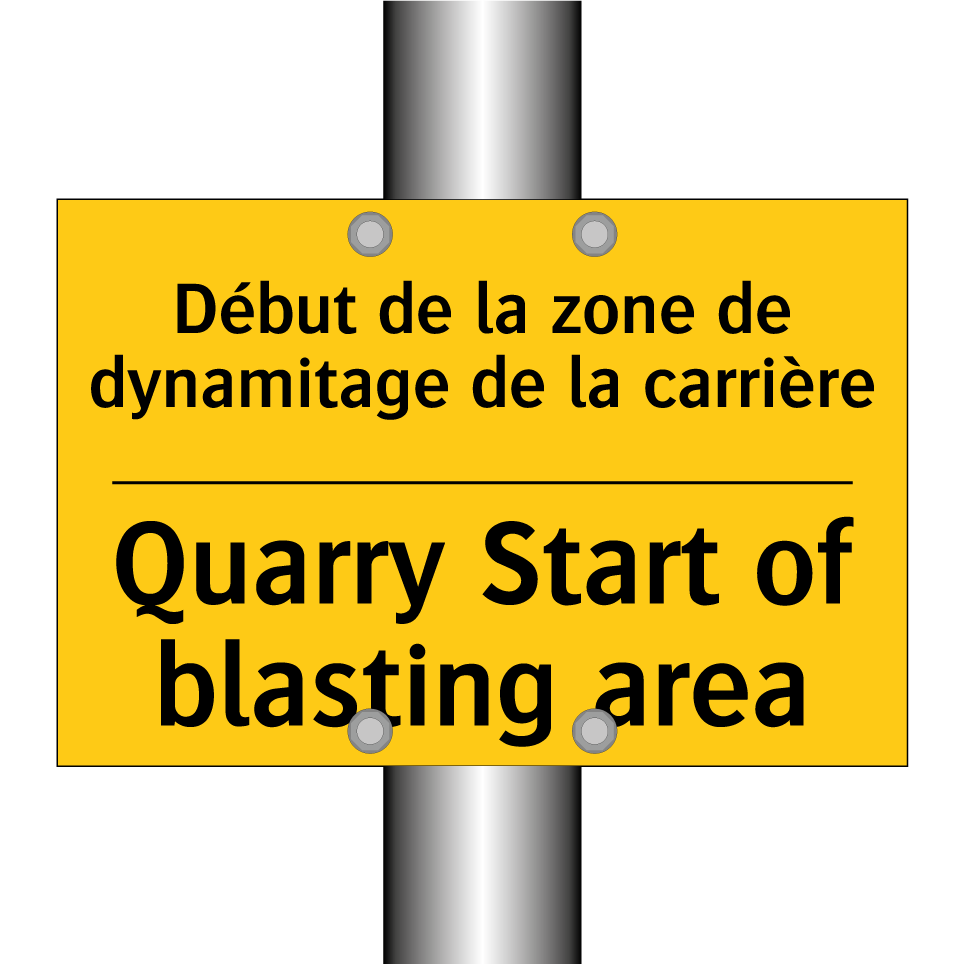Panneau d'avertissement bilingue avec texte en français : "Début de la zone de dynamitage de la carrière", et en anglais : "Quarry Start of blasting area"