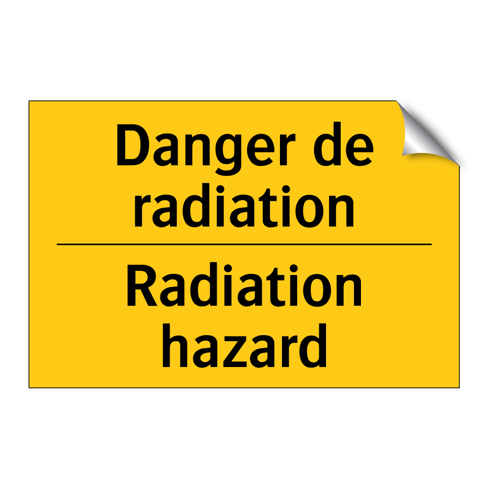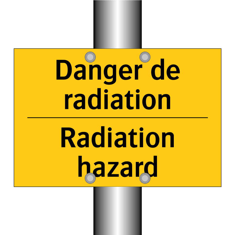 Panneau d'avertissement bilingue avec texte en français : "Danger de radiation", et en anglais : "Radiation hazard"