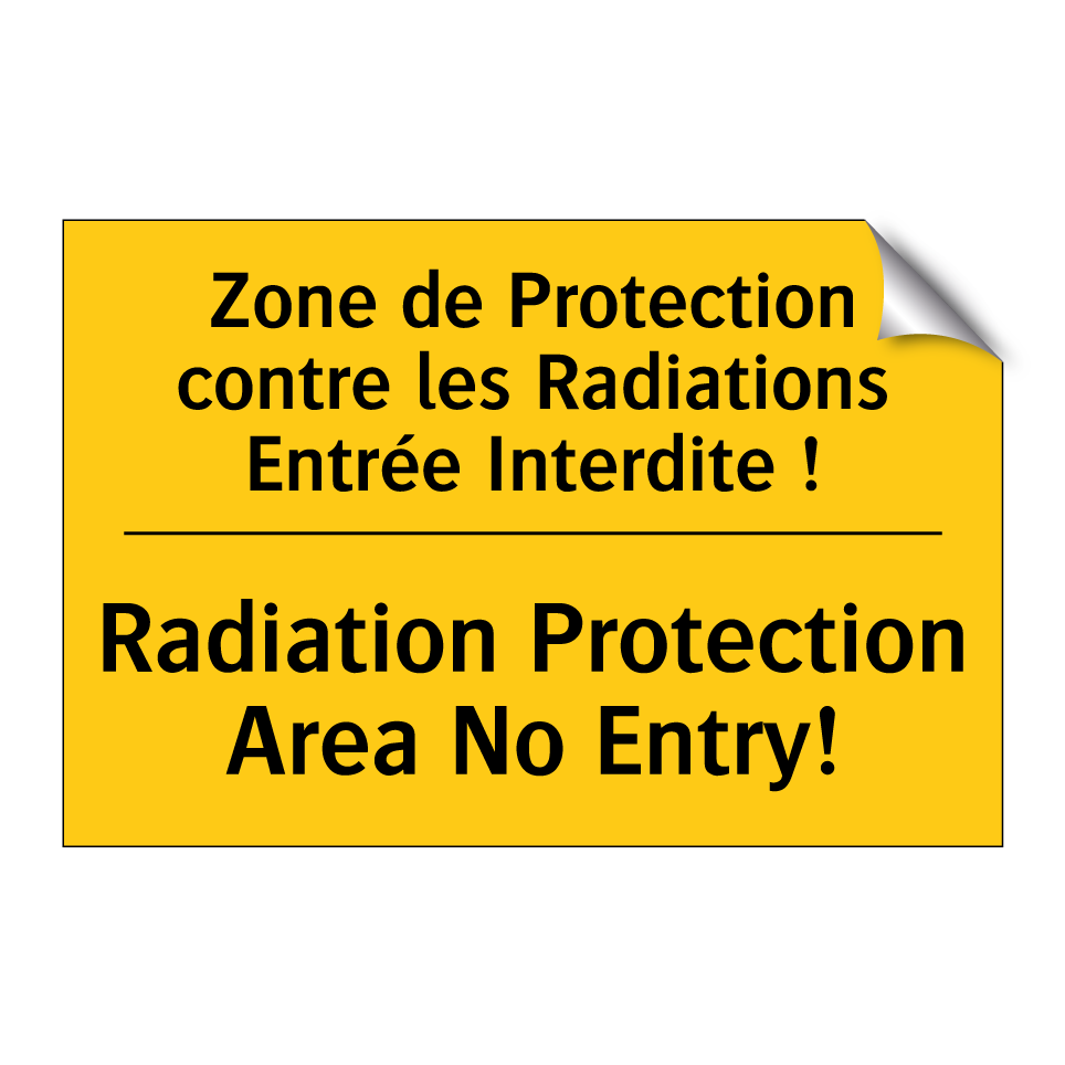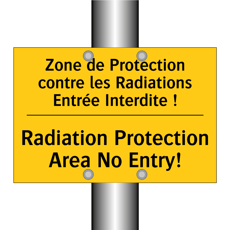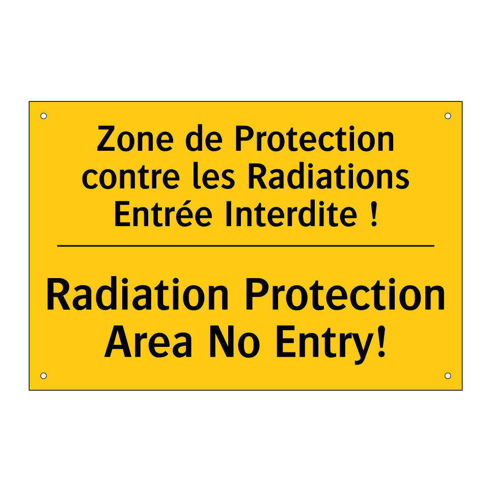 Panneau d'avertissement bilingue avec texte en français : "Zone de Protection contre les Radiations Entrée Interdite !", et en anglais : "Radiation Protection Area No Entry!"