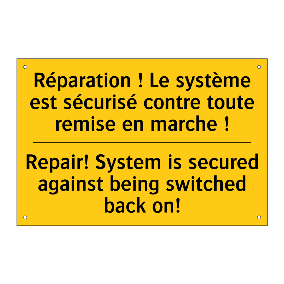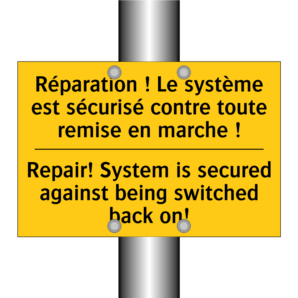 Panneau d'avertissement bilingue avec texte en français : "Réparation ! Le système est sécurisé contre toute remise en marche !", et en anglais : "Repair! System is secured against being switched back on!"
