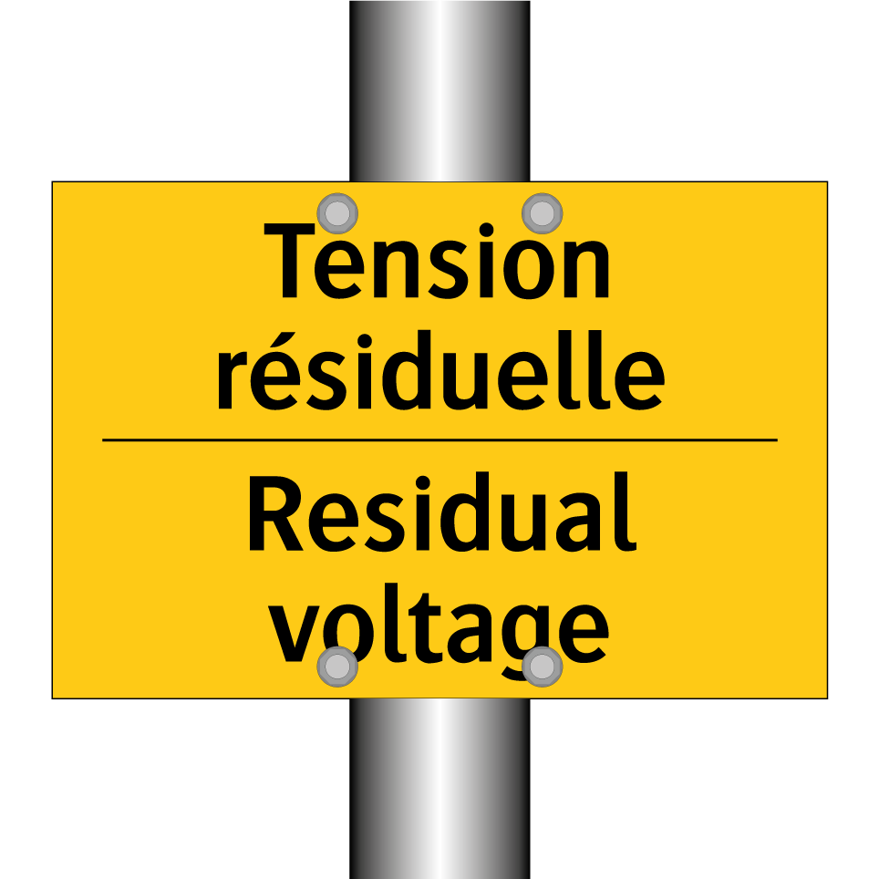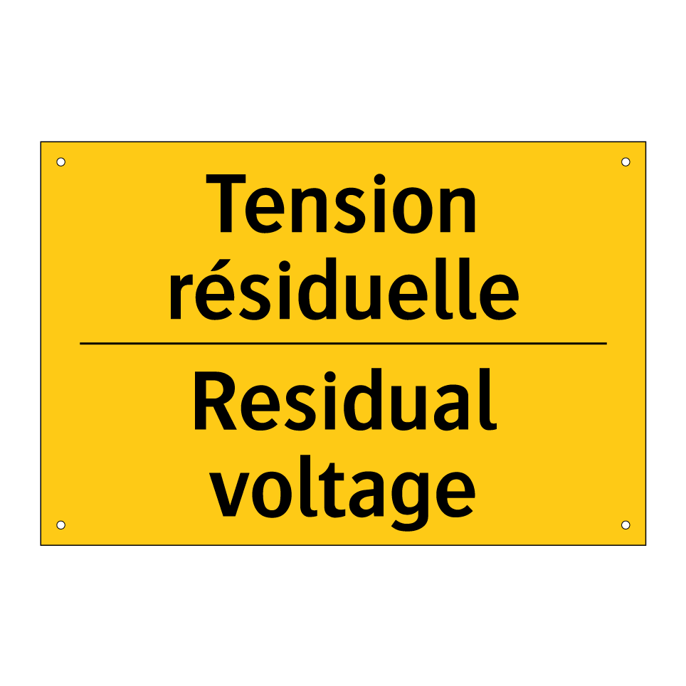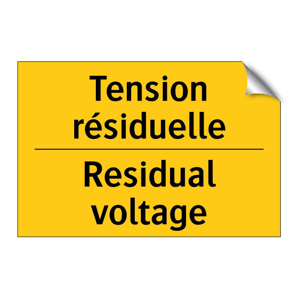 Panneau d'avertissement bilingue avec texte en français : "Tension résiduelle", et en anglais : "Residual voltage"