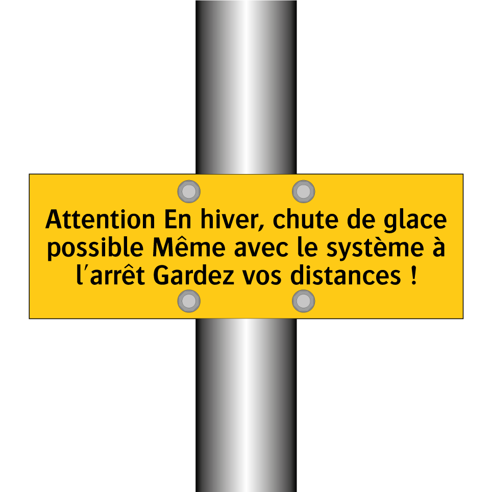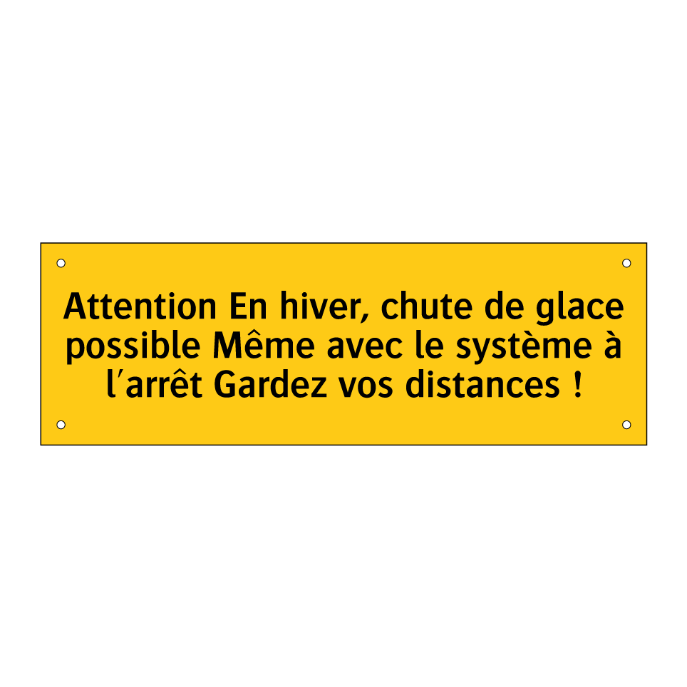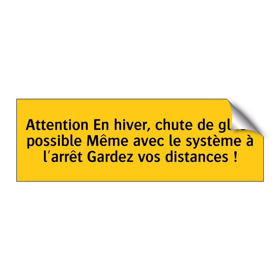 Panneau d'avertissement avec le texte : "Attention En hiver, chute de glace possible Même avec le système à l'arrêt Gardez vos distances !"