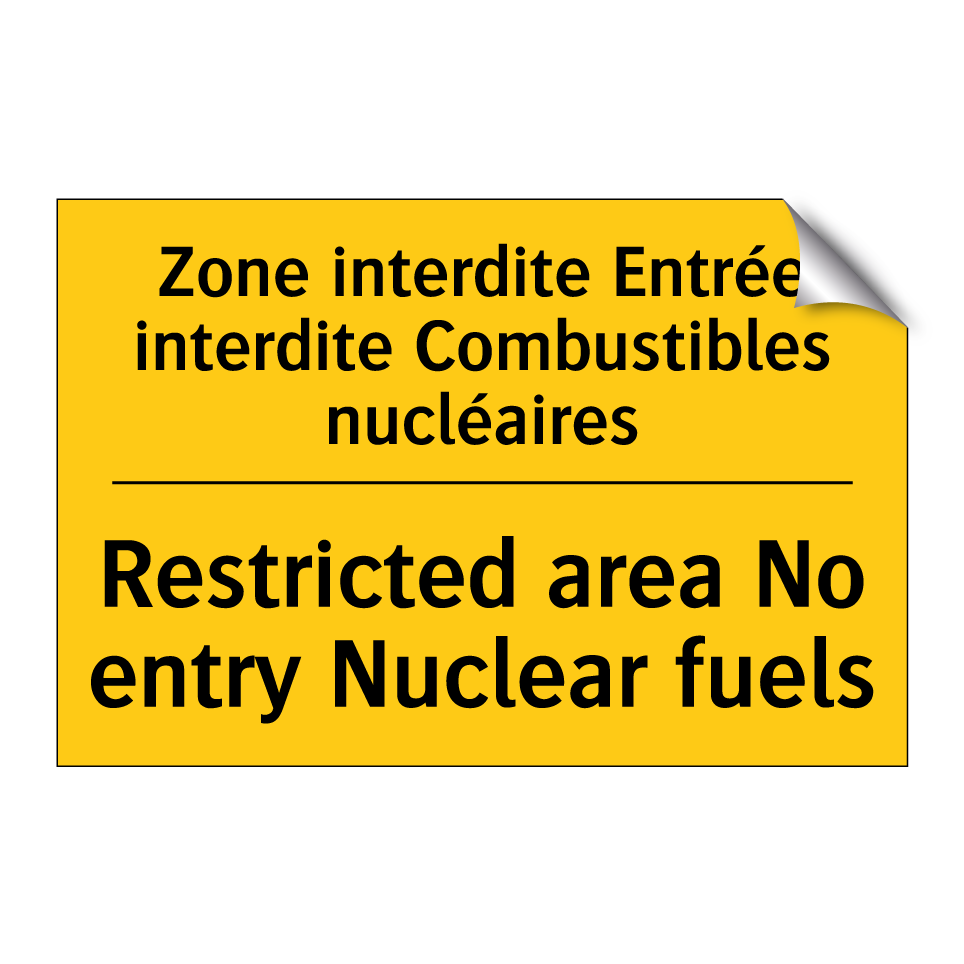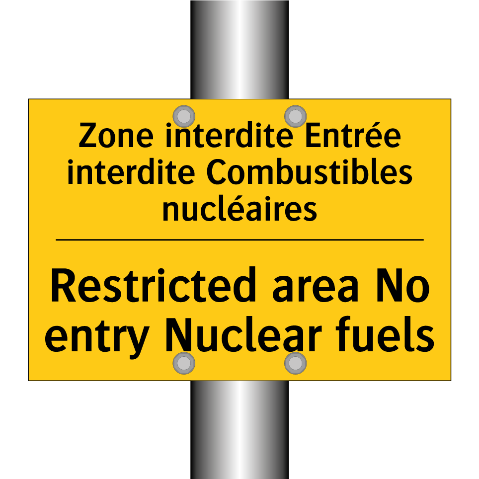Panneau d'avertissement bilingue avec texte en français : "Zone interdite Entrée interdite Combustibles nucléaires", et en anglais : "Restricted area No entry Nuclear fuels"