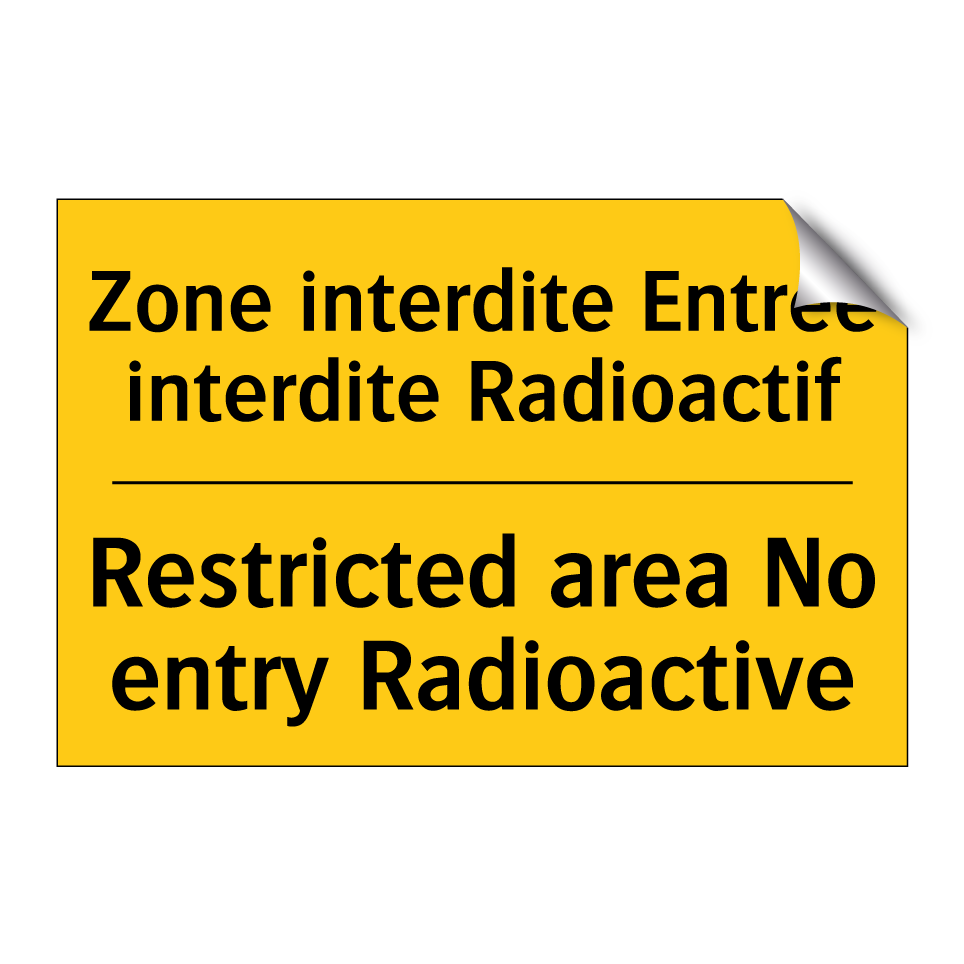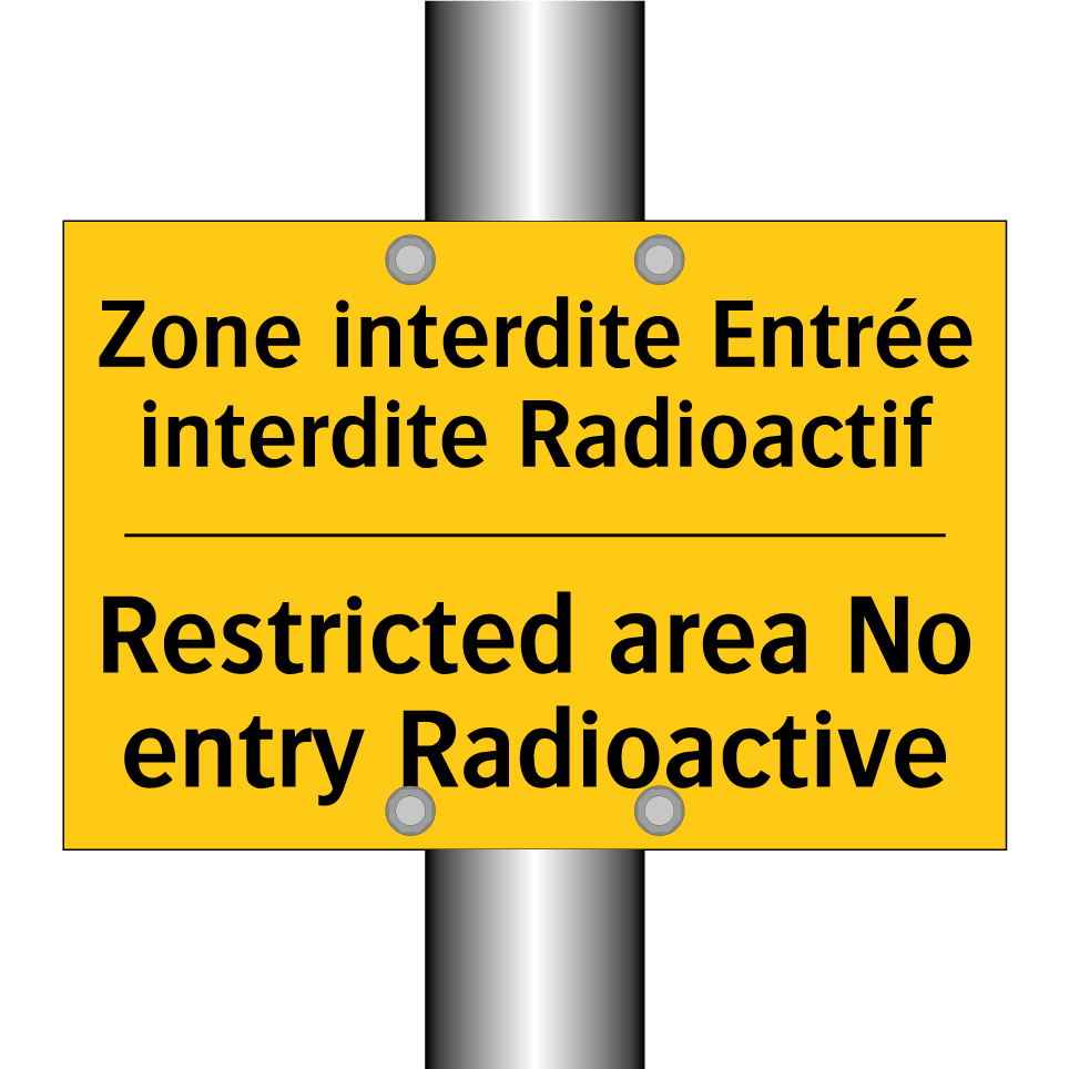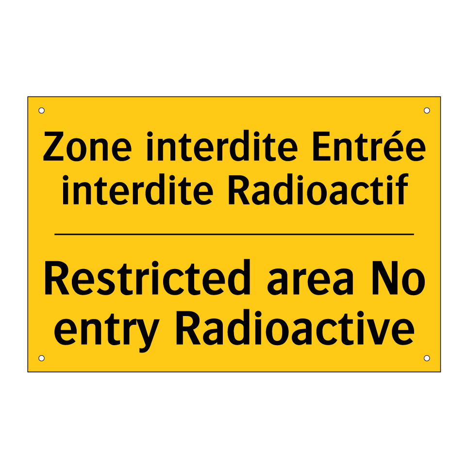 Panneau d'avertissement bilingue avec texte en français : "Zone interdite Entrée interdite Radioactif", et en anglais : "Restricted area No entry Radioactive"