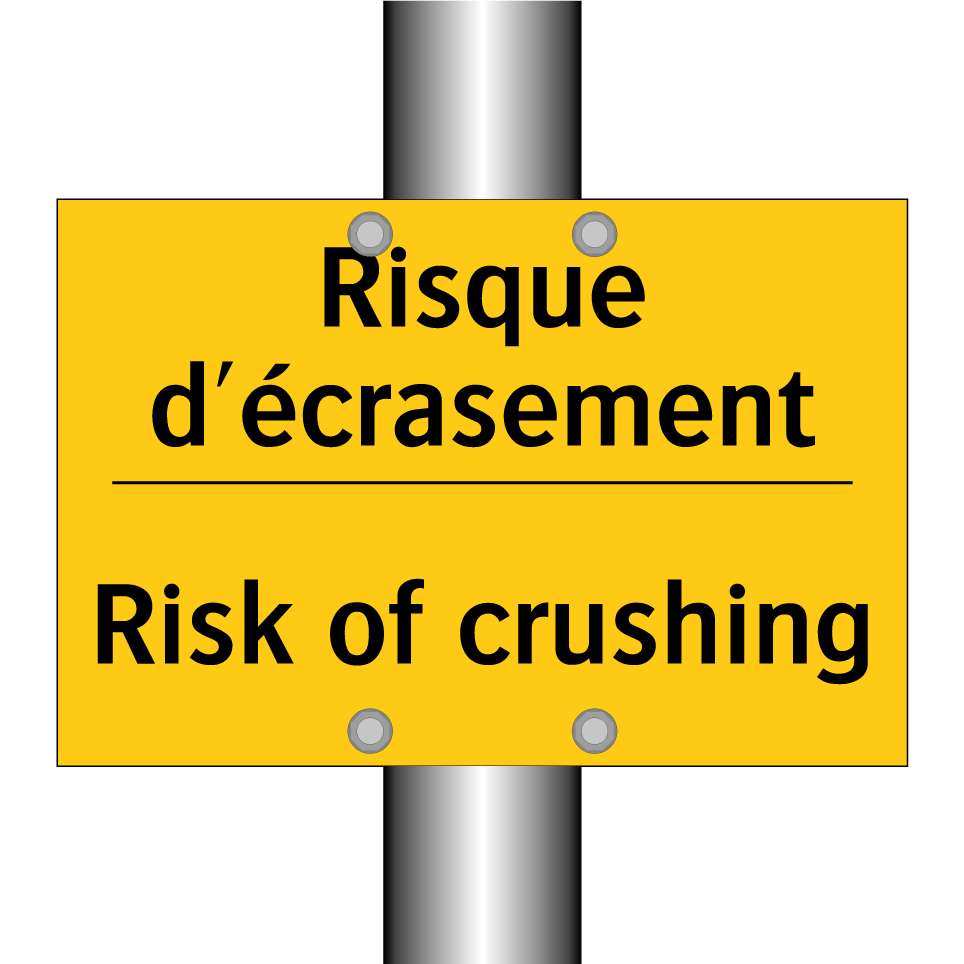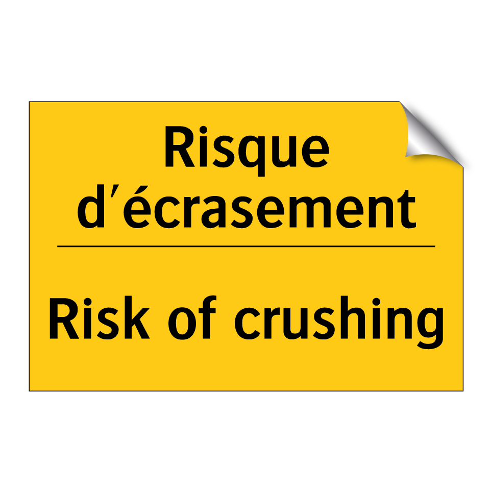 Panneau d'avertissement bilingue avec texte en français : "Risque d'écrasement", et en anglais : "Risk of crushing"