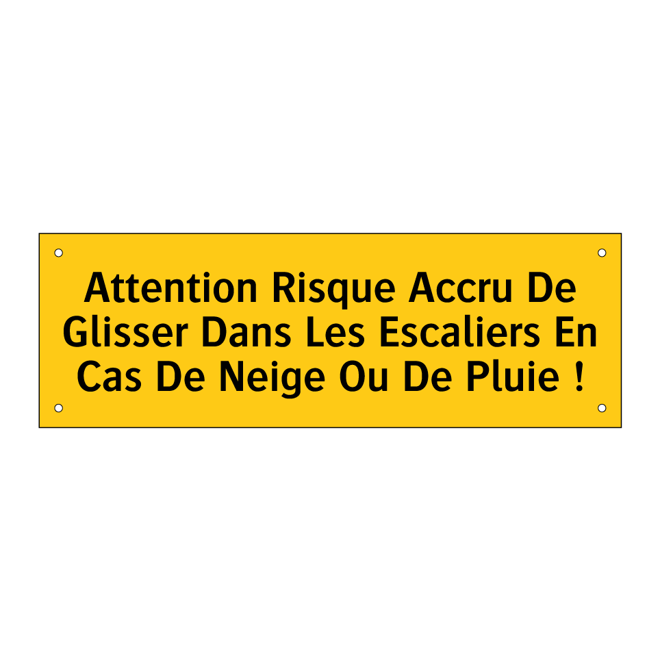 Panneau d'avertissement avec le texte : "Attention Risque Accru De Glisser Dans Les Escaliers En Cas De Neige Ou De Pluie !"