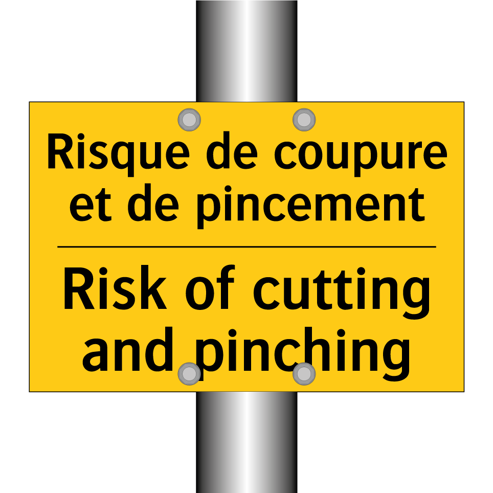 Panneau d'avertissement bilingue avec texte en français : "Risque de coupure et de pincement", et en anglais : "Risk of cutting and pinching"