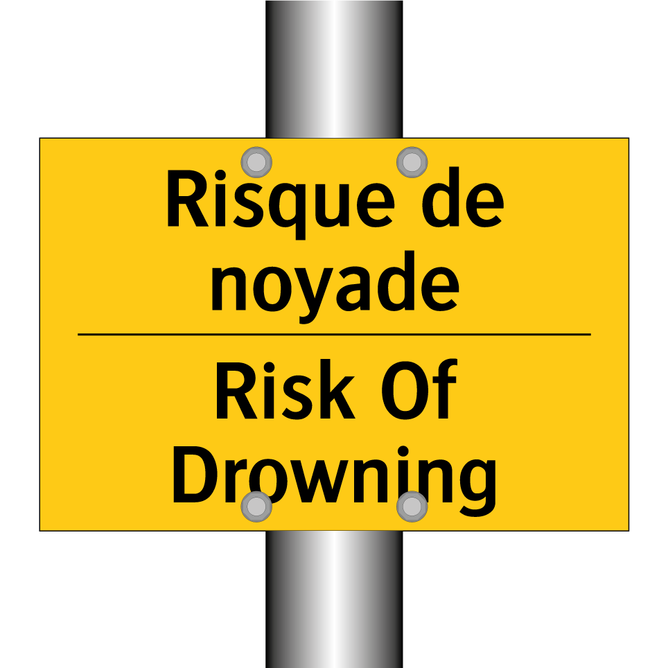 Panneau d'avertissement bilingue avec texte en français : "Risque de noyade", et en anglais : "Risk Of Drowning"