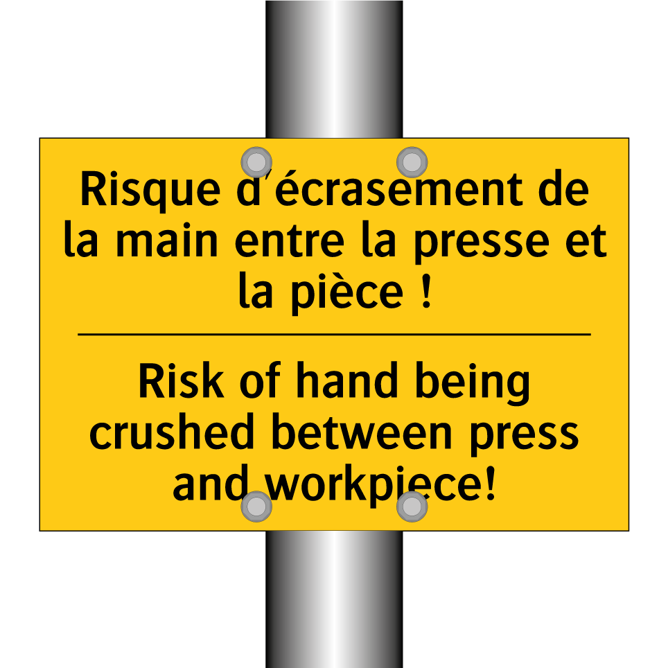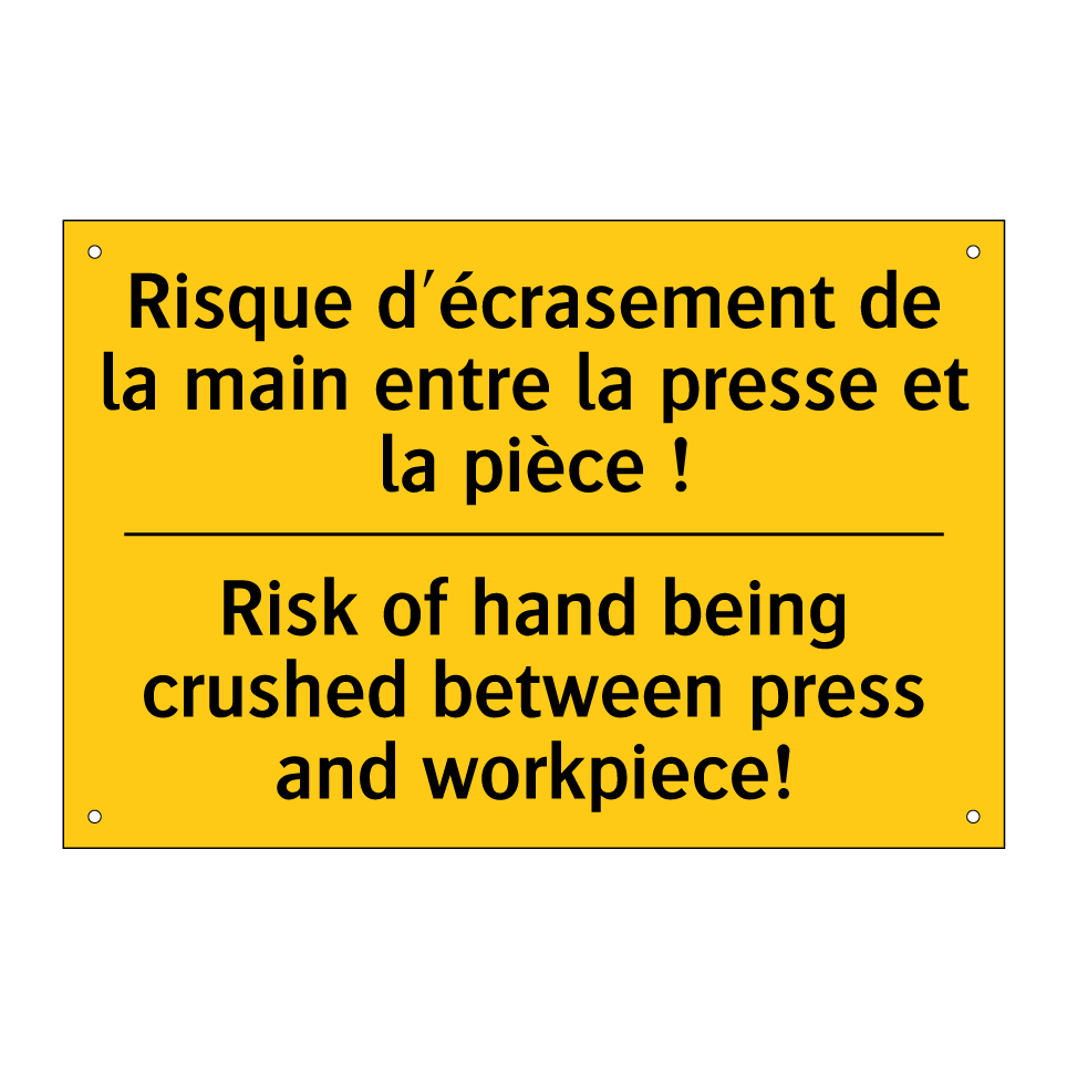 Panneau d'avertissement bilingue avec texte en français : "Risque d'écrasement de la main entre la presse et la pièce !", et en anglais : "Risk of hand being crushed between press and workpiece!"