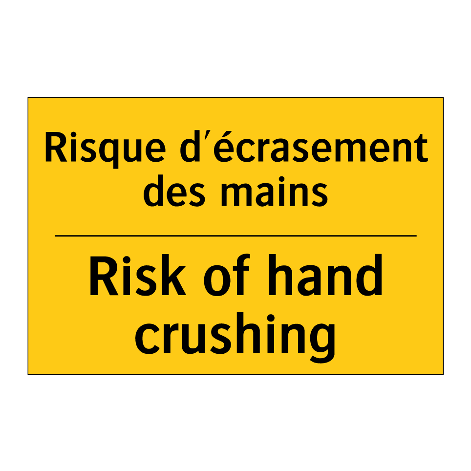 Panneau d'avertissement bilingue avec texte en français : "Risque d'écrasement des mains", et en anglais : "Risk of hand crushing"