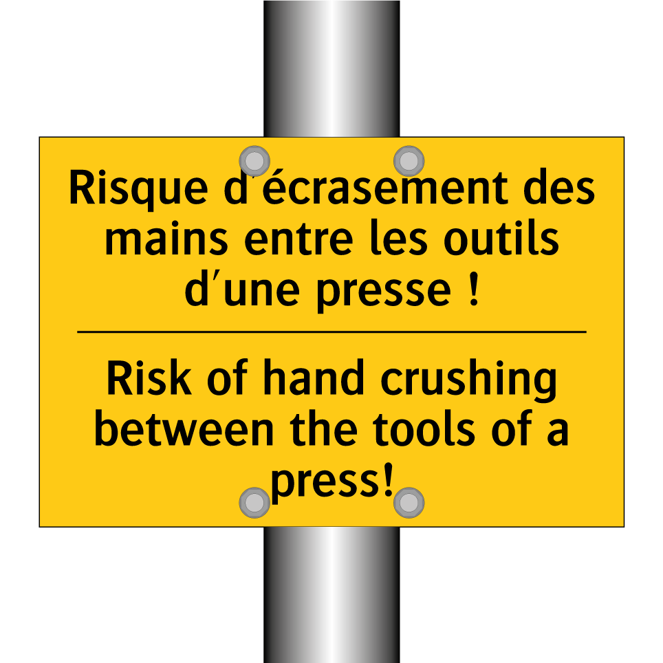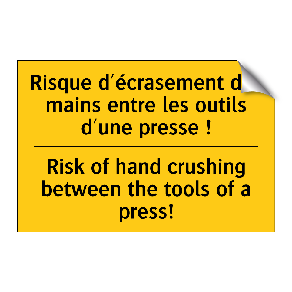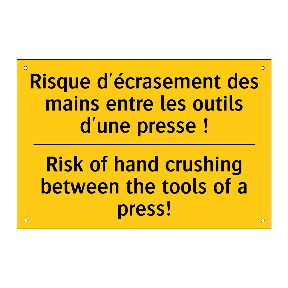 Panneau d'avertissement bilingue avec texte en français : "Risque d'écrasement des mains entre les outils d'une presse !", et en anglais : "Risk of hand crushing between the tools of a press!"