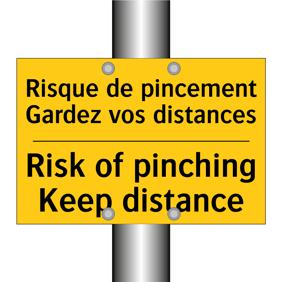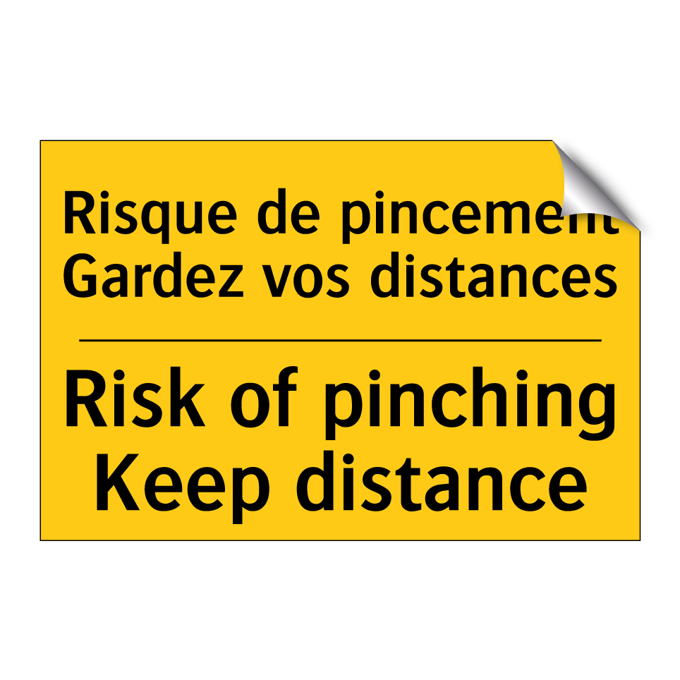 Panneau d'avertissement bilingue avec texte en français : "Risque de pincement Gardez vos distances", et en anglais : "Risk of pinching Keep distance"