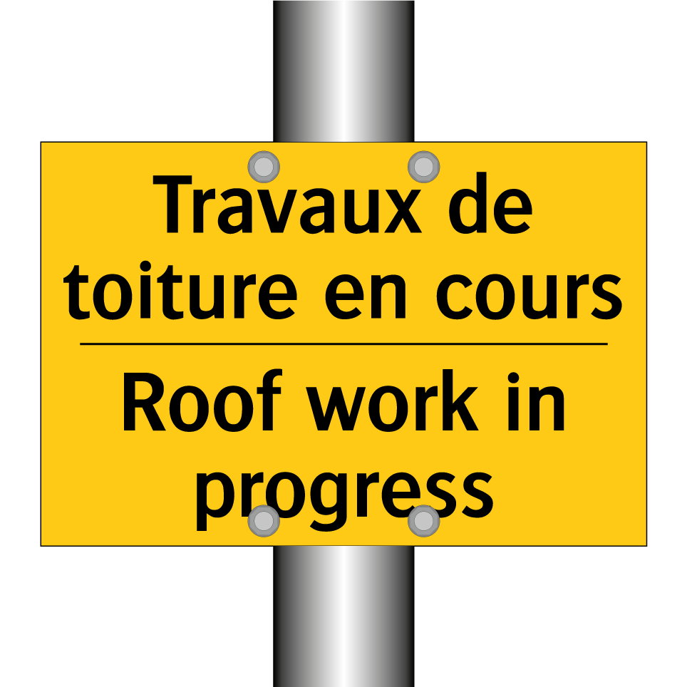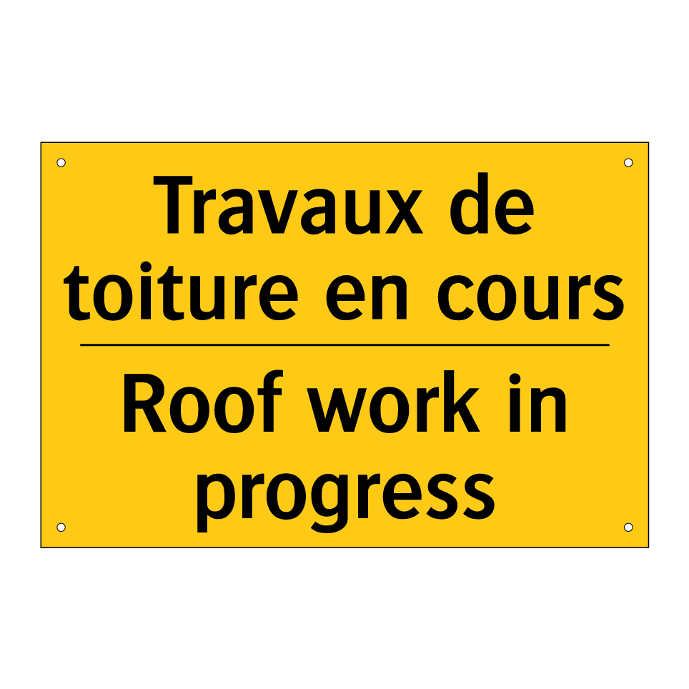 Panneau d'avertissement bilingue avec texte en français : "Travaux de toiture en cours", et en anglais : "Roof work in progress"