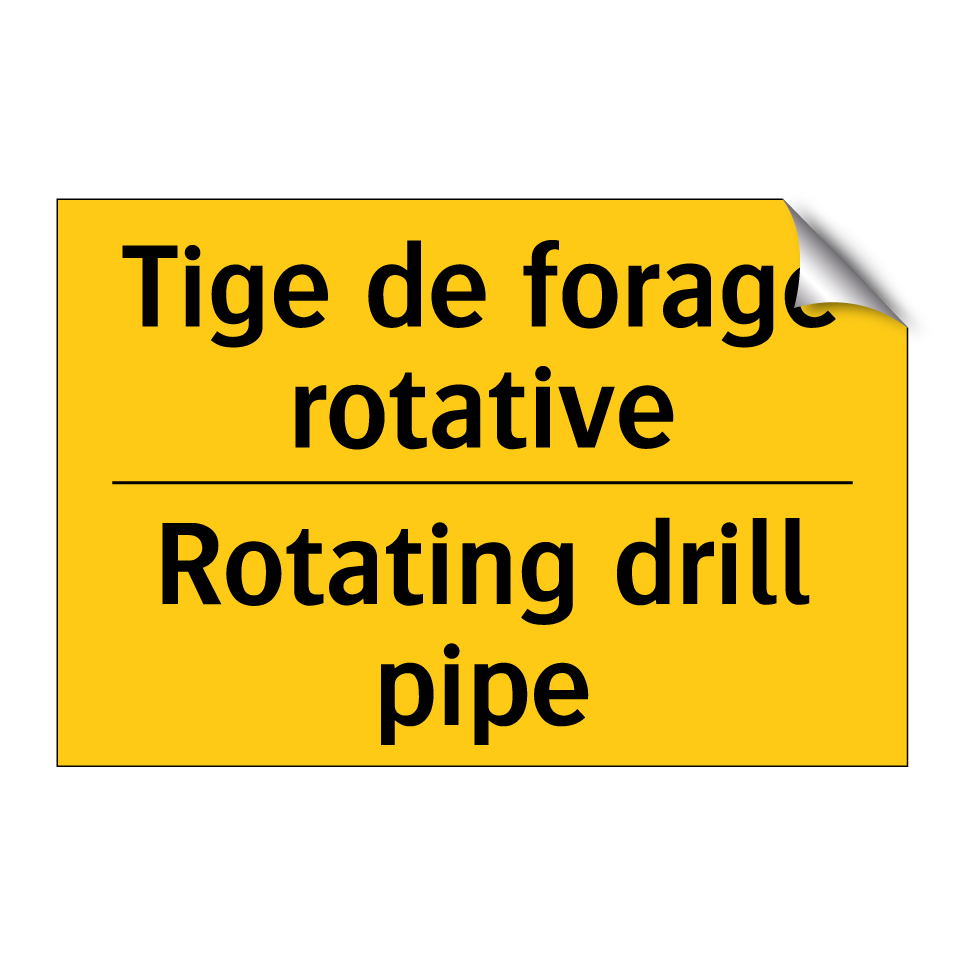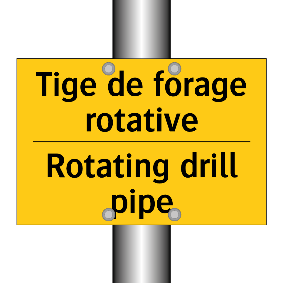 Panneau d'avertissement bilingue avec texte en français : "Tige de forage rotative", et en anglais : "Rotating drill pipe"