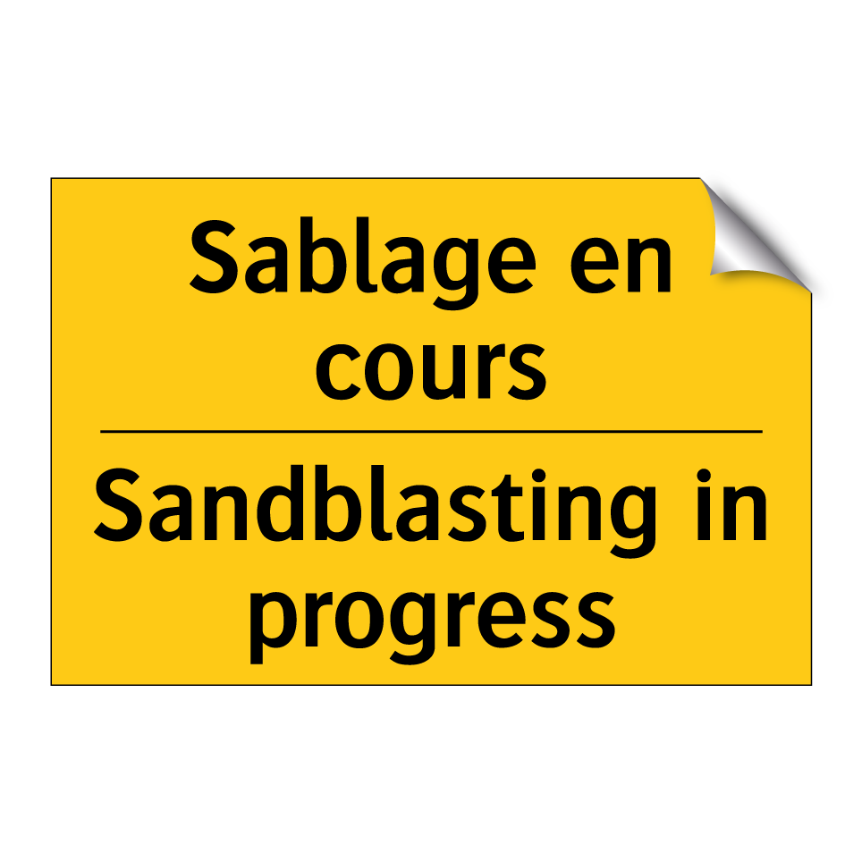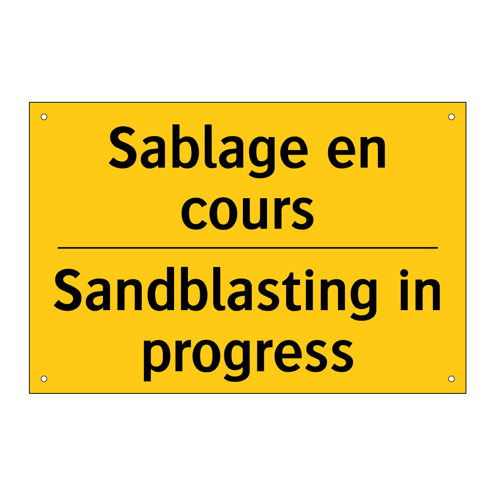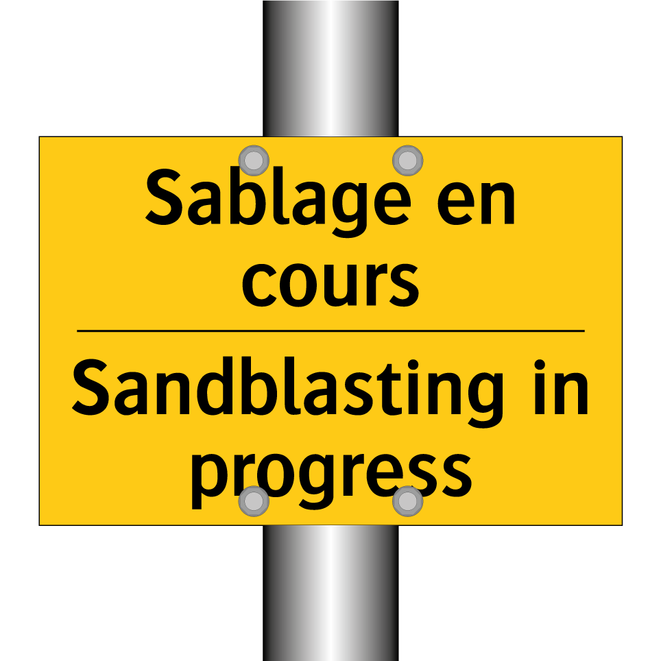 Panneau d'avertissement bilingue avec texte en français : "Sablage en cours", et en anglais : "Sandblasting in progress"