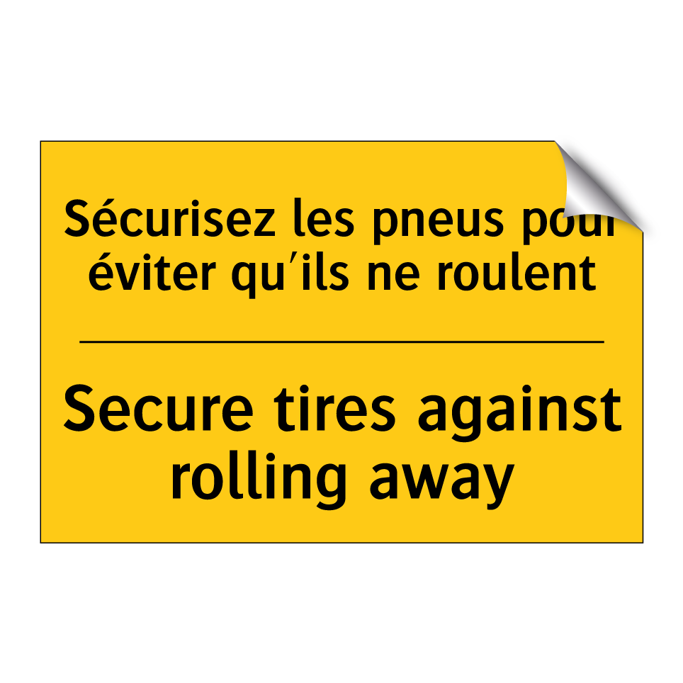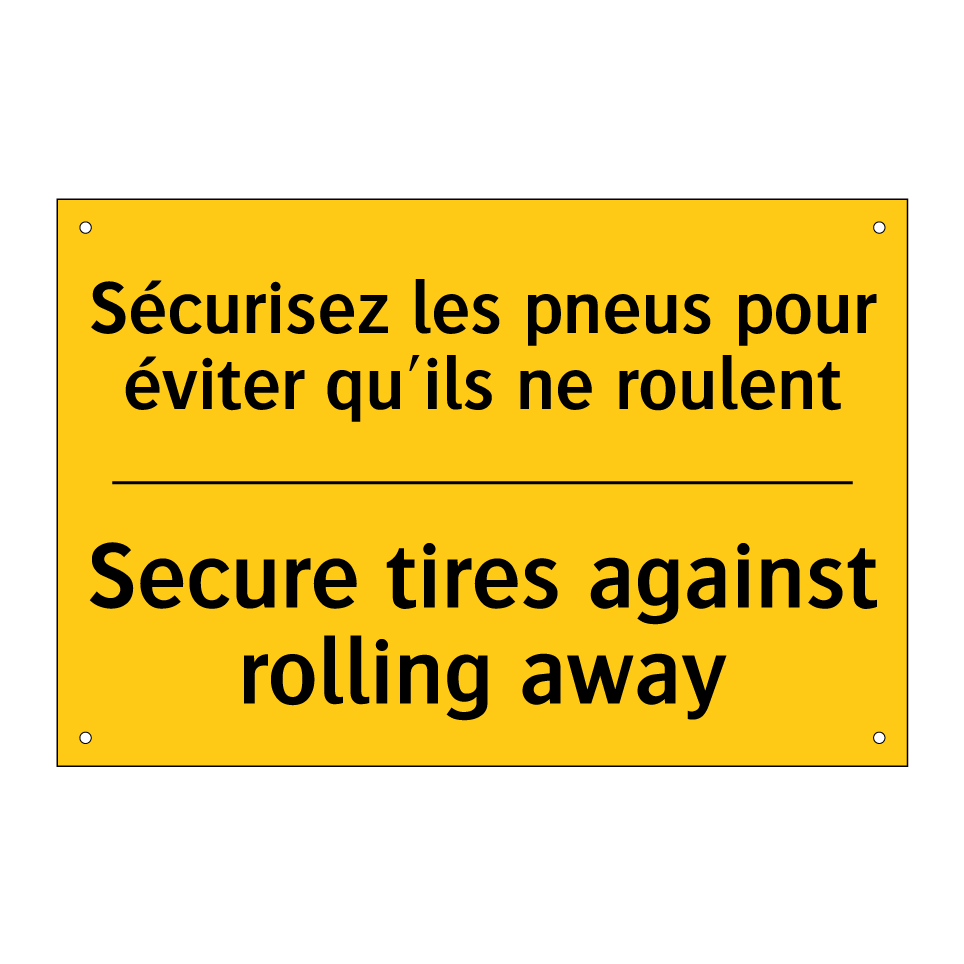 Panneau d'avertissement bilingue avec texte en français : "Sécurisez les pneus pour éviter qu'ils ne roulent", et en anglais : "Secure tires against rolling away"