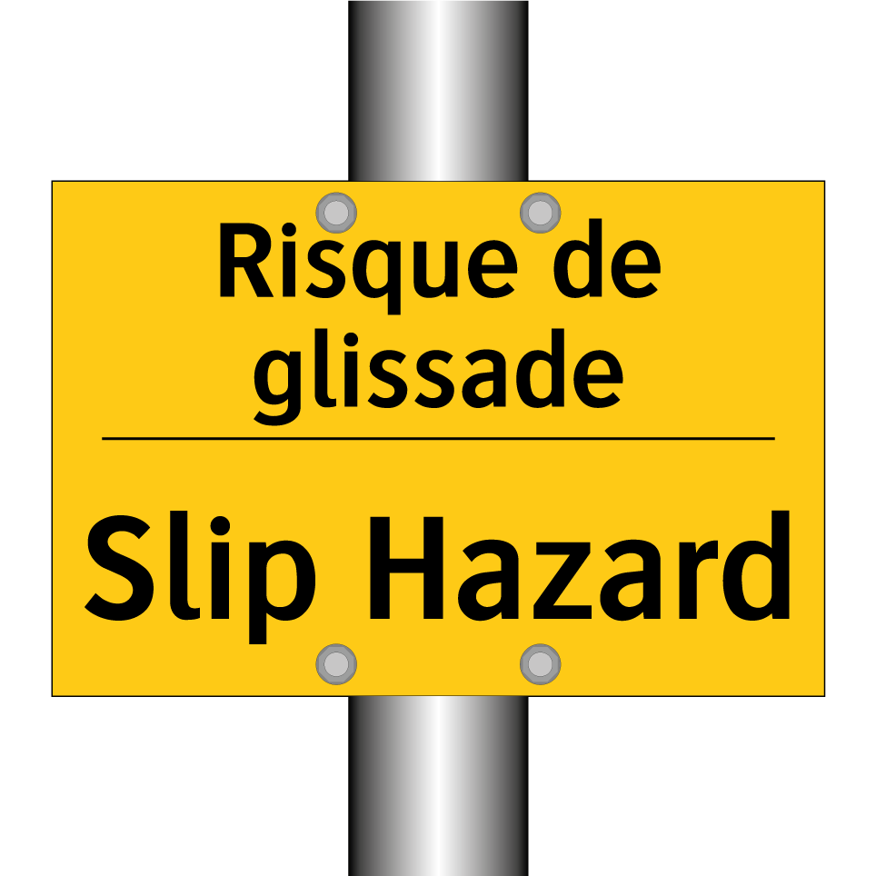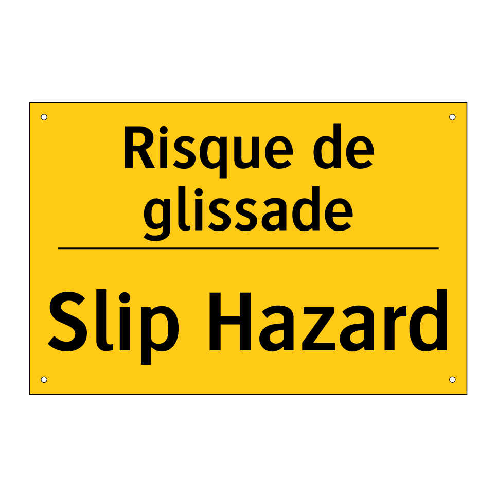 Panneau d'avertissement bilingue avec texte en français : "Risque de glissade", et en anglais : "Slip Hazard"