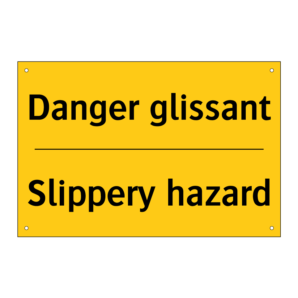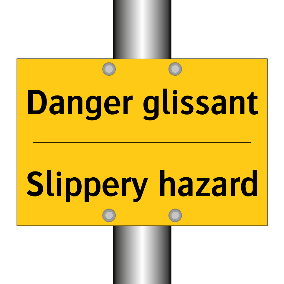 Panneau d'avertissement bilingue avec texte en français : "Danger glissant", et en anglais : "Slippery hazard"