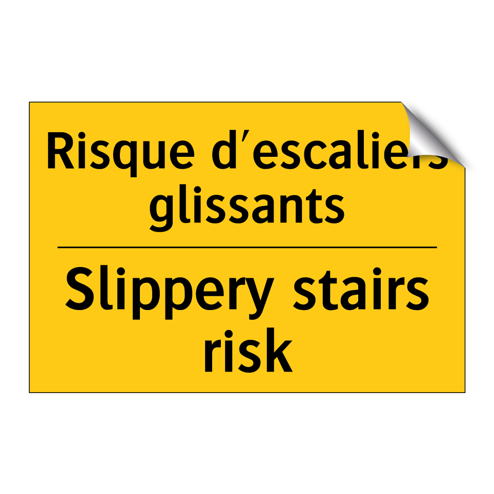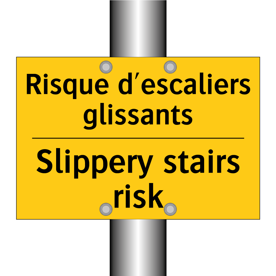 Panneau d'avertissement bilingue avec texte en français : "Risque d'escaliers glissants", et en anglais : "Slippery stairs risk"