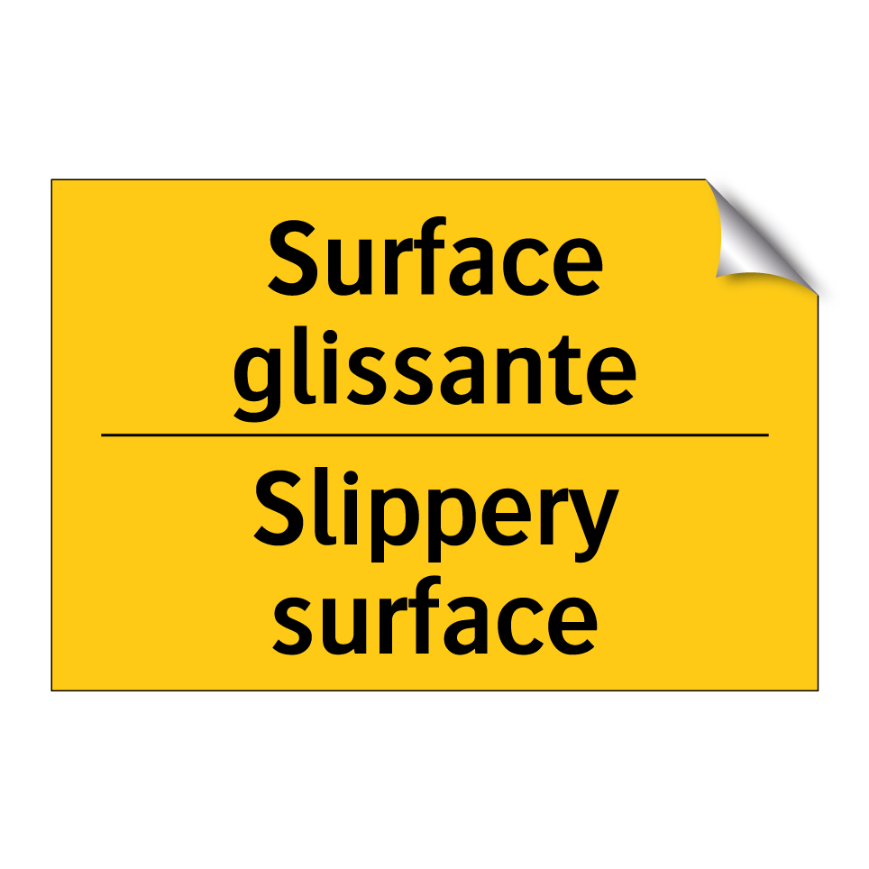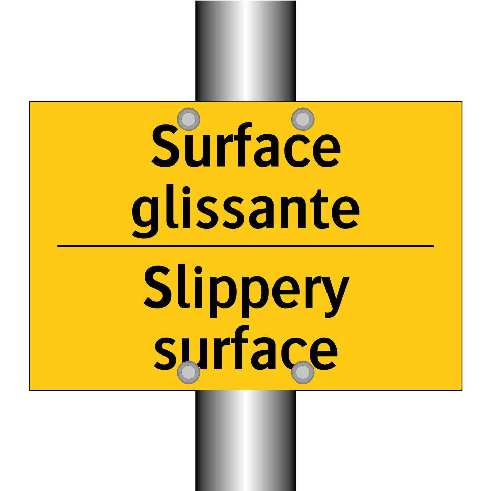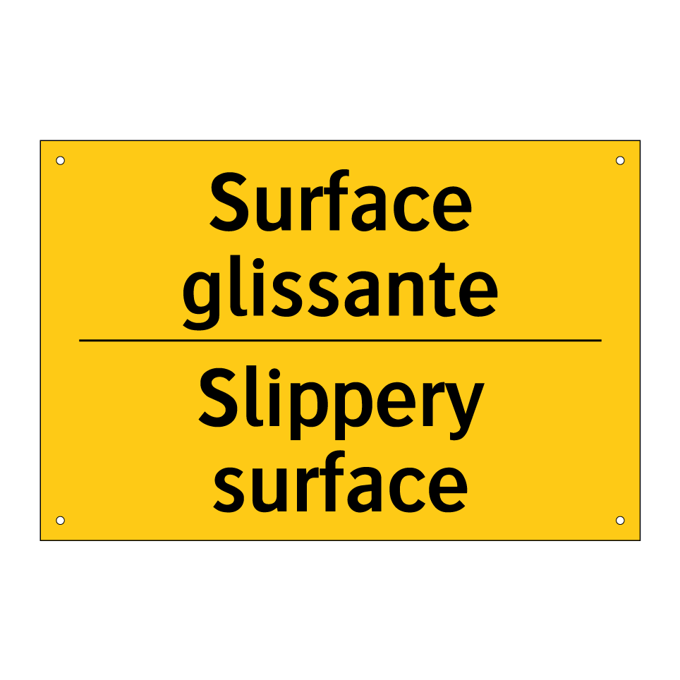 Panneau d'avertissement bilingue avec texte en français : "Surface glissante", et en anglais : "Slippery surface"