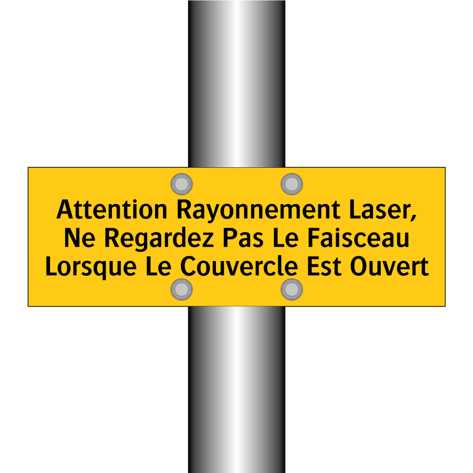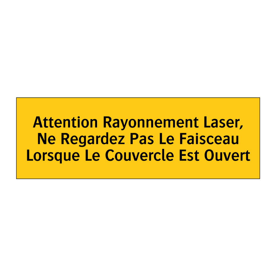 Panneau d'avertissement avec le texte : "Attention Rayonnement Laser, Ne Regardez Pas Le Faisceau Lorsque Le Couvercle Est Ouvert"