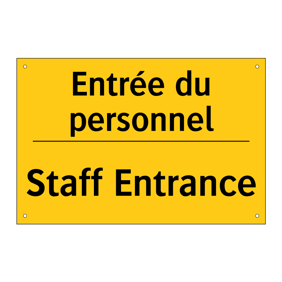 Panneau d'avertissement bilingue avec texte en français : "Entrée du personnel", et en anglais : "Staff Entrance"