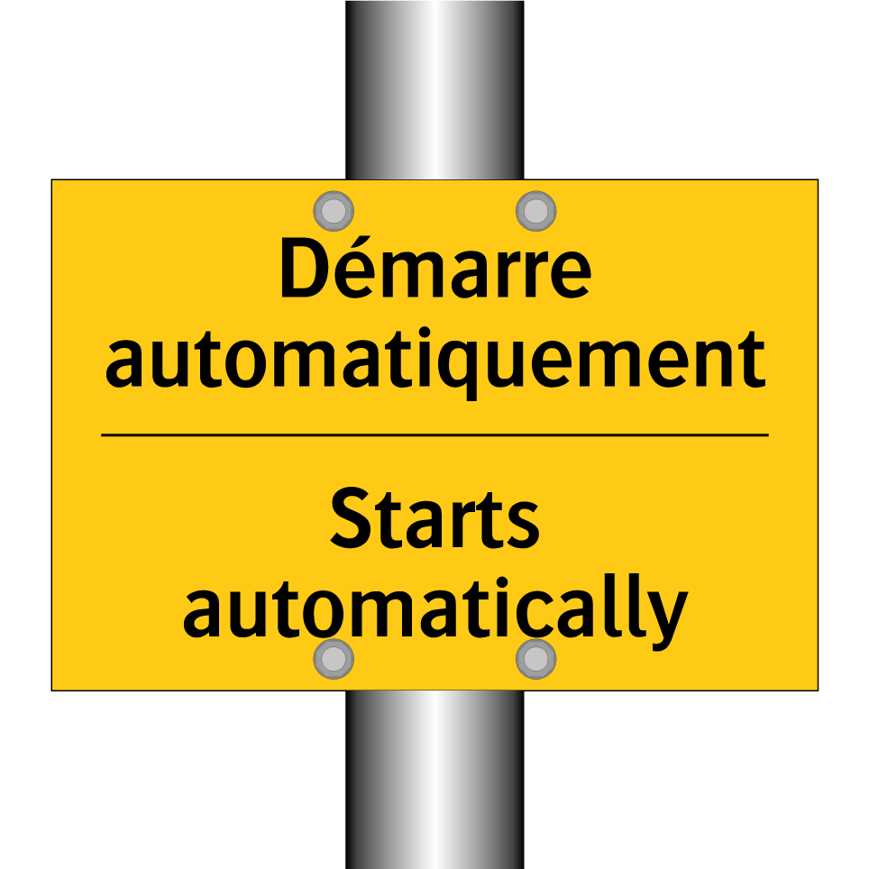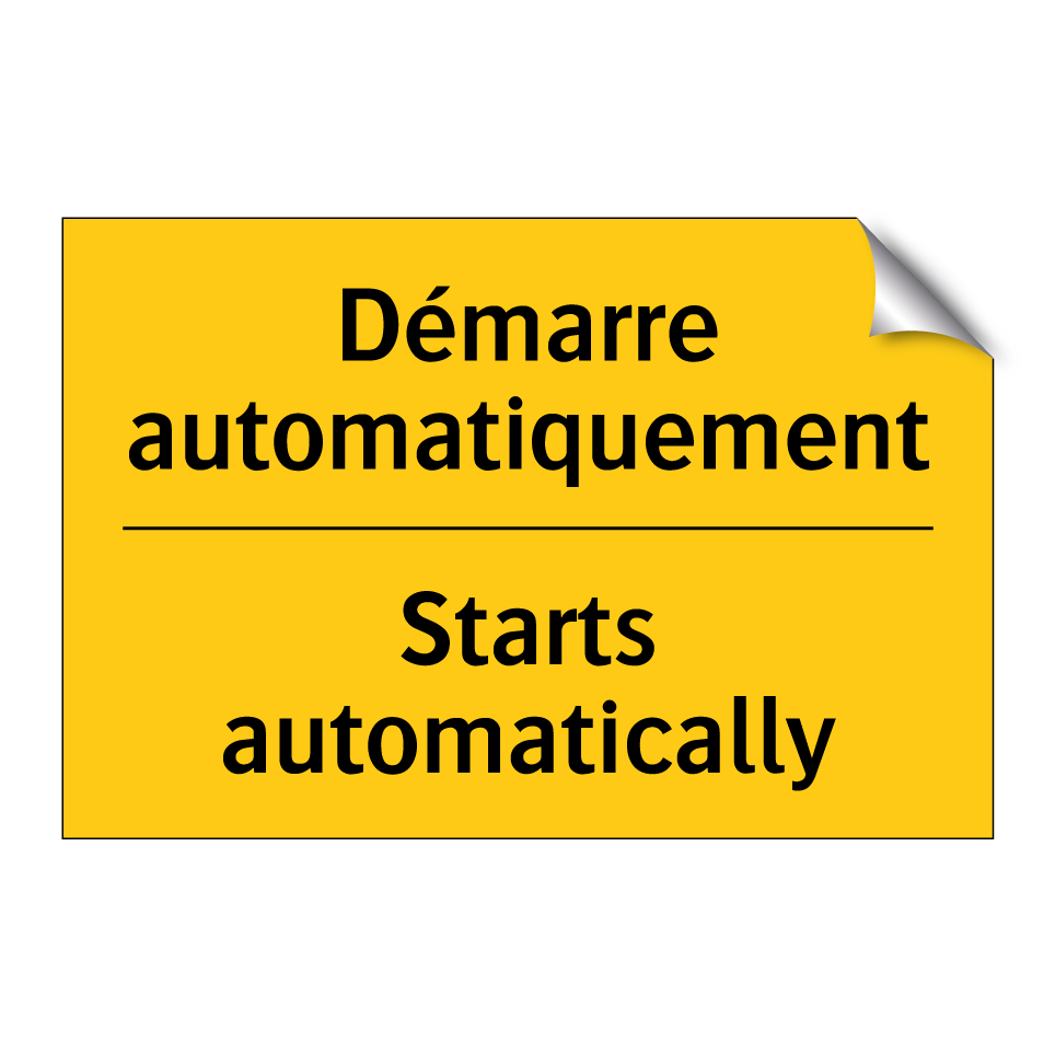 Panneau d'avertissement bilingue avec texte en français : "Démarre automatiquement", et en anglais : "Starts automatically"