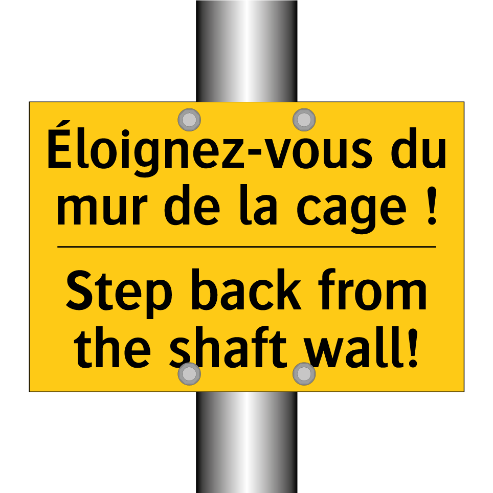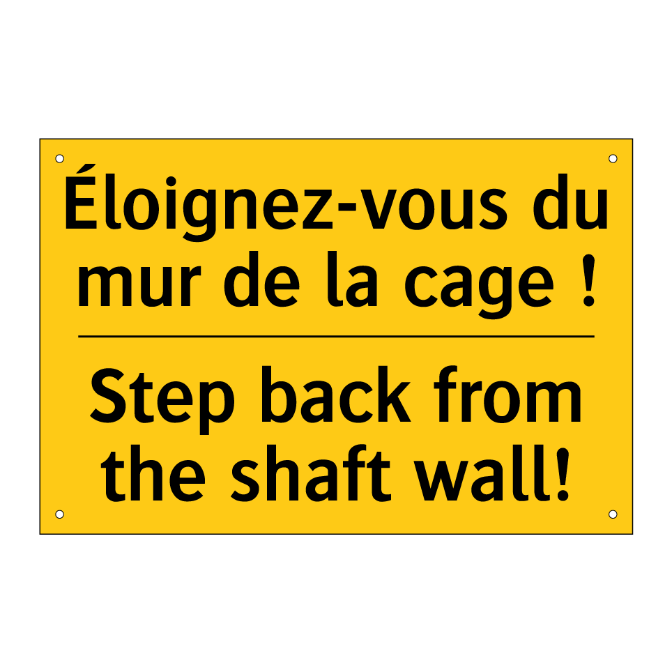 Panneau d'avertissement bilingue avec texte en français : "Éloignez-vous du mur de la cage !", et en anglais : "Step back from the shaft wall!"