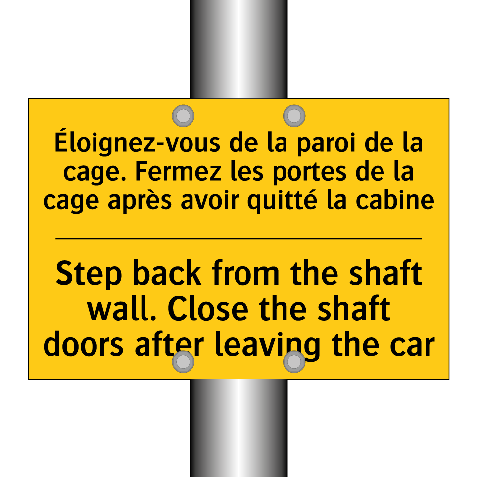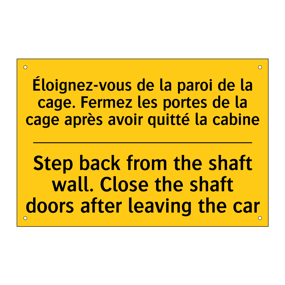 Panneau d'avertissement bilingue avec texte en français : "Éloignez-vous de la paroi de la cage. Fermez les portes de la cage après avoir quitté la cabine", et en anglais : "Step back from the shaft wall. Close the shaft doors after leaving the car"