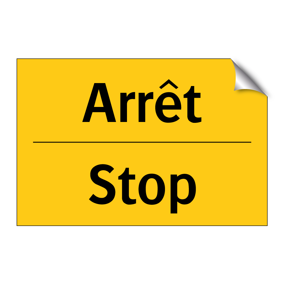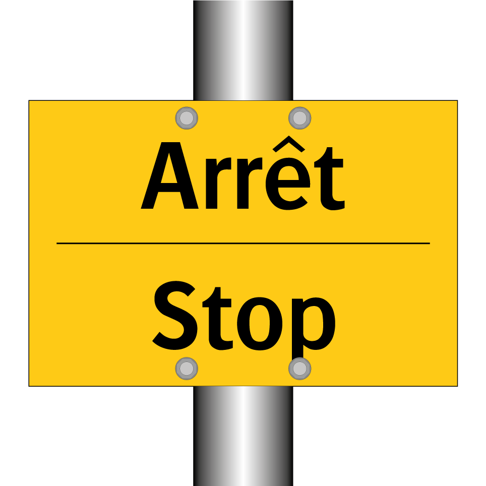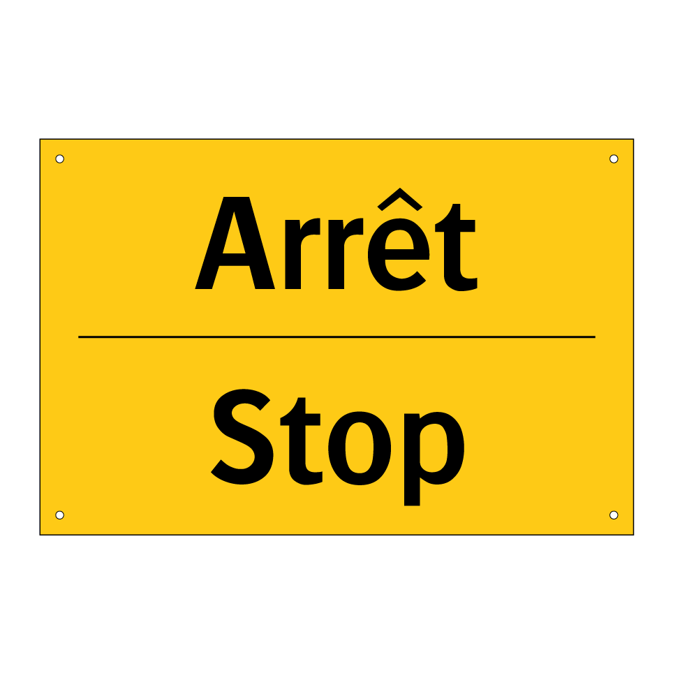 Panneau d'avertissement bilingue avec texte en français : "Arrêt", et en anglais : "Stop"