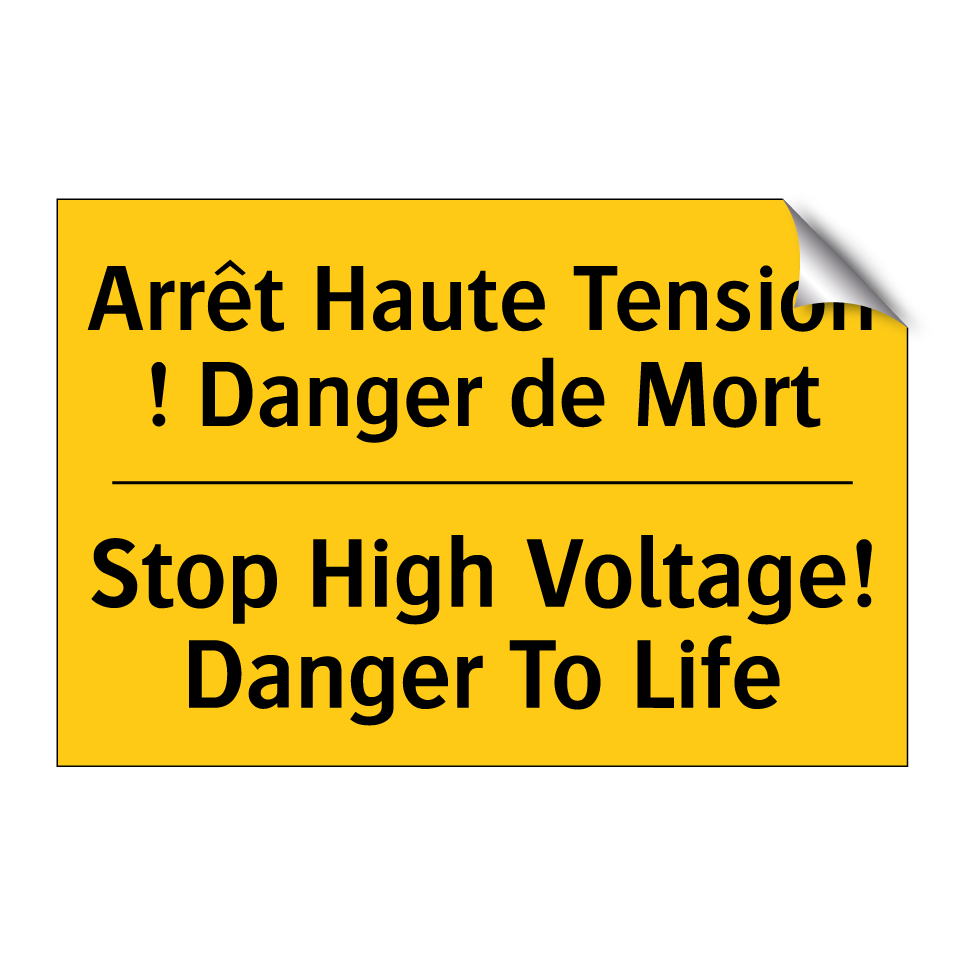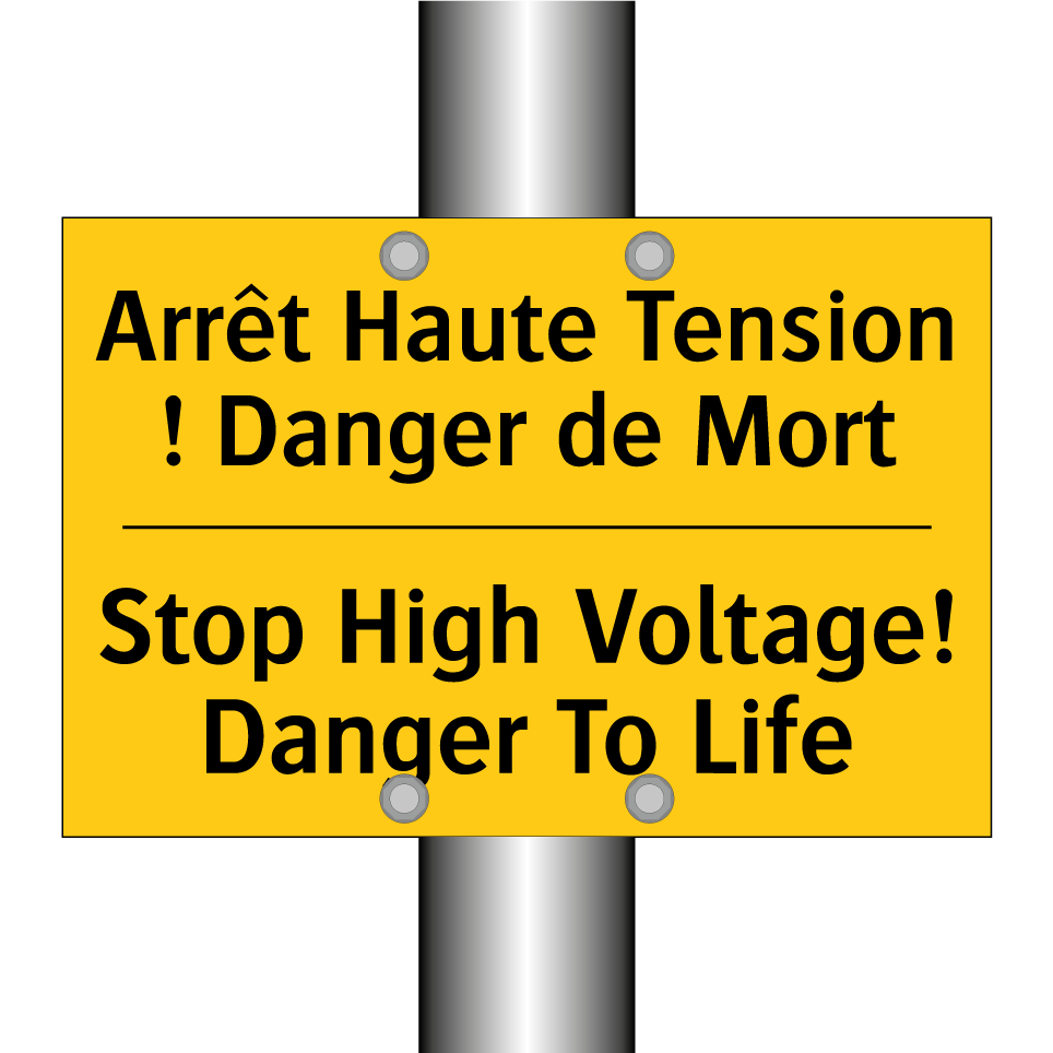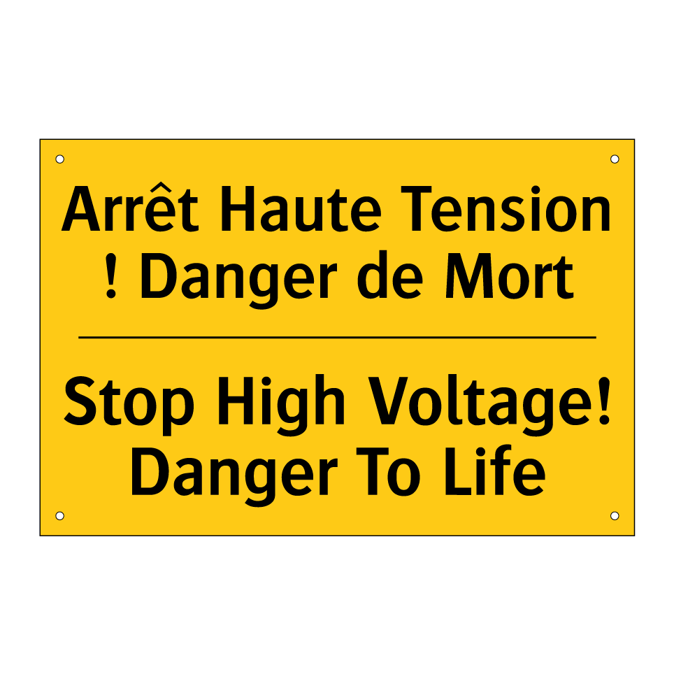 Panneau d'avertissement bilingue avec texte en français : "Arrêt Haute Tension ! Danger de Mort", et en anglais : "Stop High Voltage! Danger To Life"